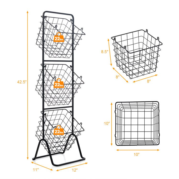 This 3-tier market basket stand provides sufficient room to stock up on various items. It can organize vegetables, and fruit in your kitchen, classify snack bags in the living room, assort laundry detergent near the washing machine, not to mention store other sundries. The wire basket features a tilted hanging design for easy fetch and is easy to remove for independent use. It is easy to connect the frame and hang up the baskets, then the assembly is finished! This fruit basket stand converts to 3 height forms --- 1-basket, 2-basket and 3-basket, which is an ideal organizing solution for specific needs. The stable triangle metal base and rounded corner will ensure safe use.