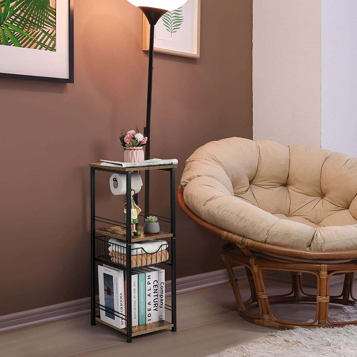 1.With the classic rustic brown and black matching, the bathroom storage organizer with toilet paper holder can be served not only as a bathroom towel storage shelf, but also a beautiful eye-catching decorative shelf in your living room. The compact size of this bathroom storage cabinet allows it to be placed in various corners, making full use of the unused space.