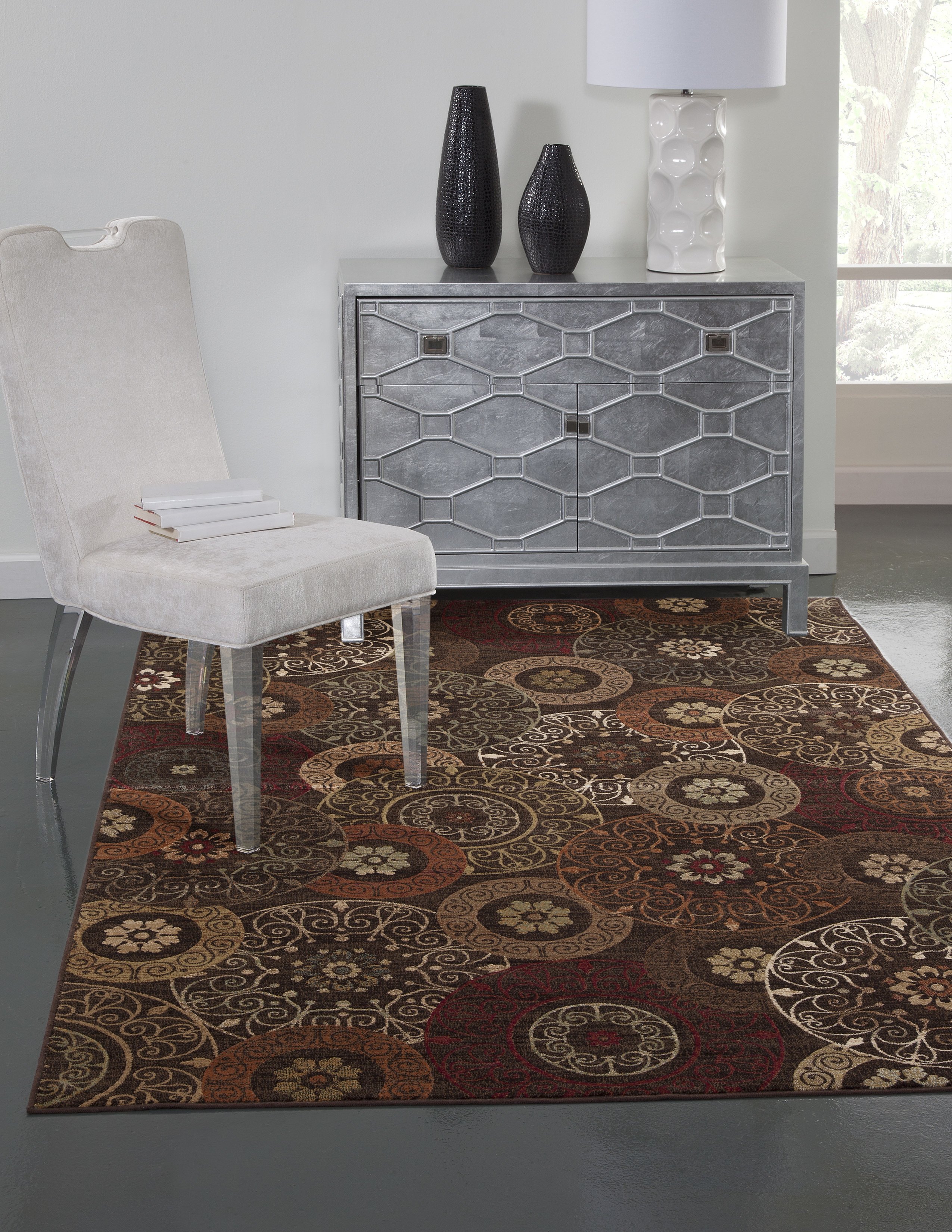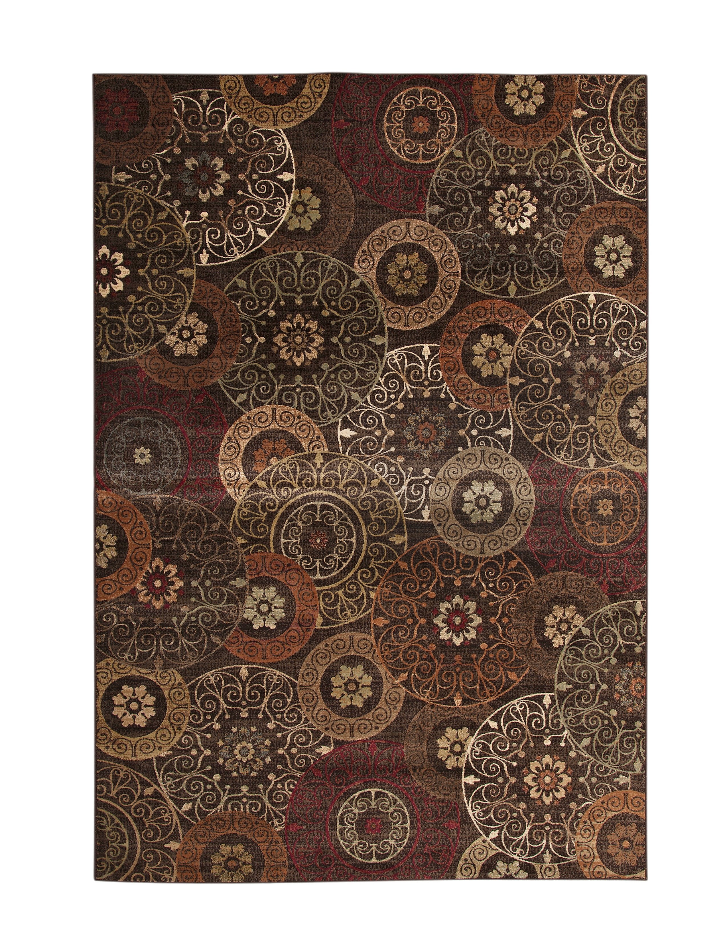 The Lundy Rust, Brown, and Ivory Area Rug is machine woven from silky viscose yarns, featuring the look and feel of real silk at a fraction of the cost. Woven from a precise, machine loomed technique, the collection combines a rich color pallete to create a sophisticated group of designs at very competitive pricing. The Sonomas are available in both contemporary and transitional looks, and will complement a wide range of room styles.Materials: 100% ViscoseDelicate circles in rust, orange and ivory against a brown background.Machine woven using silky viscose yarnsFlat PileCreates a natural source of sound absorptionPulls the overall look of the room togetherContains Latex: YesSize (ft/in): 7'10" x 10'1"Care Instructions: Vacuum your rug regularly. Some initial shedding of the wool pile is normal and will not affect the life of the rug. Clean spills immediately by blotting any liquid with a clean, dry, un-dyed cloth. If heavily soiled, rugs may be cleaned professionally. Do not pull any loose ends; any frayed edges can be trimmed with scissors, if needed. Use a rug pad for even wear, increased protection, and to prevent slippage.