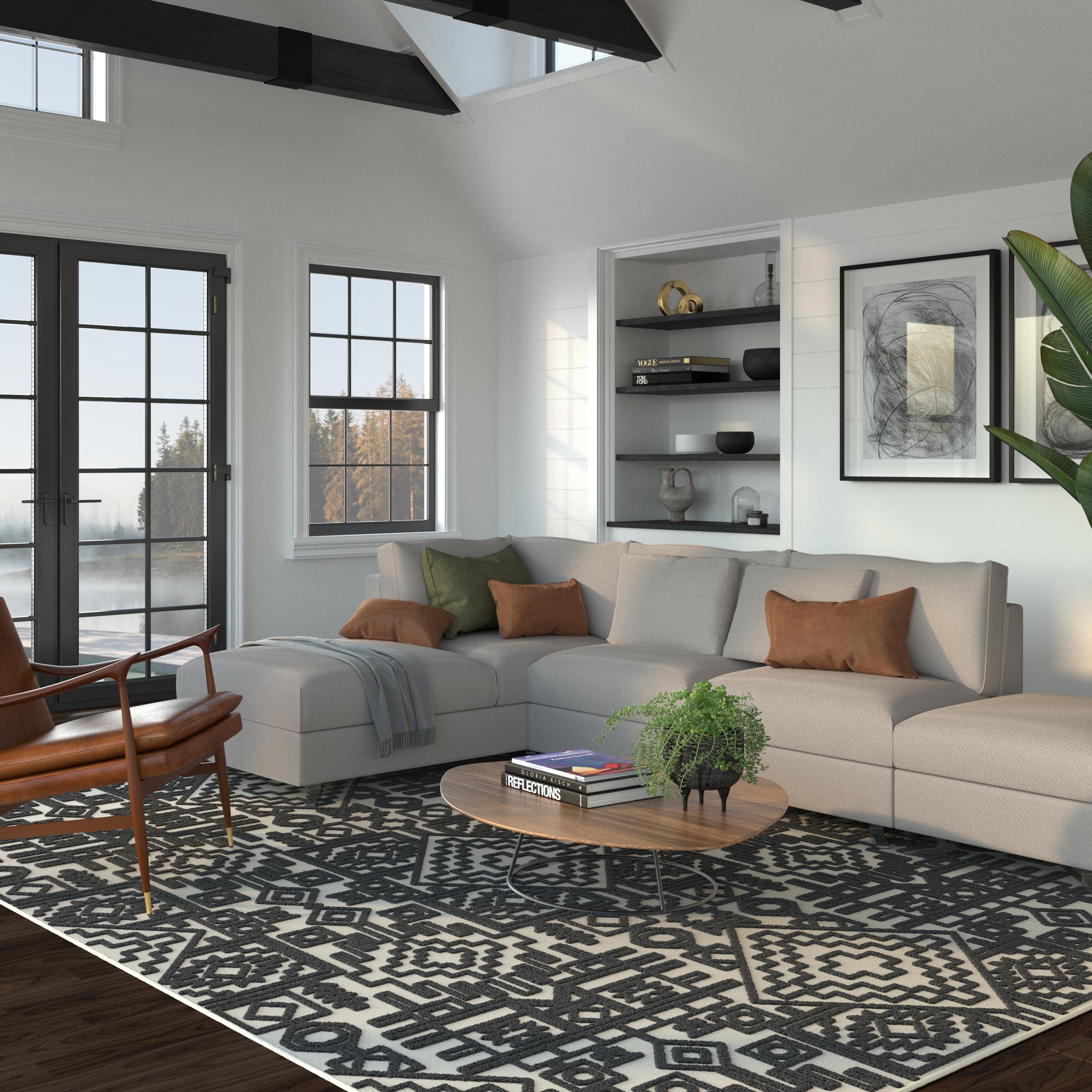 Rich texture and exquisite designs make the Mercana an easy addition to accent any room in your home. The high/ low carved design is crafted from Acrylic Chenille and Viscose for a beautiful, dimensional look that will bring eye-catching style to any space. The geometric tribal motif easily blends with most decors while the neutral color schemes will accentuate many of today's popular trends. The low pile height makes this rug perfect for high traffic areas and where door clearance is needed. The durable jute backing helps keep the rug in place, however we recommend a rug pad to prevent slipping (sold separately).Materials: 80% Viscose - 20% Acrylic ChenilleFeatures a neutral ivory base with black raised geometric, tribal designsMachine woven with a ground chenille base and raised viscose patternFlat pile is great for entryways where door clearance is neededDecorative high-low pattern adds depth and style to your décorSoft to the touchDurable Jute backing helps protect floors and keep the rug from slippingContains Latex: YesSize (ft/in): 5'3" x 7'6"Care Instructions: Spot clean as needed, Professional cleaning recommended