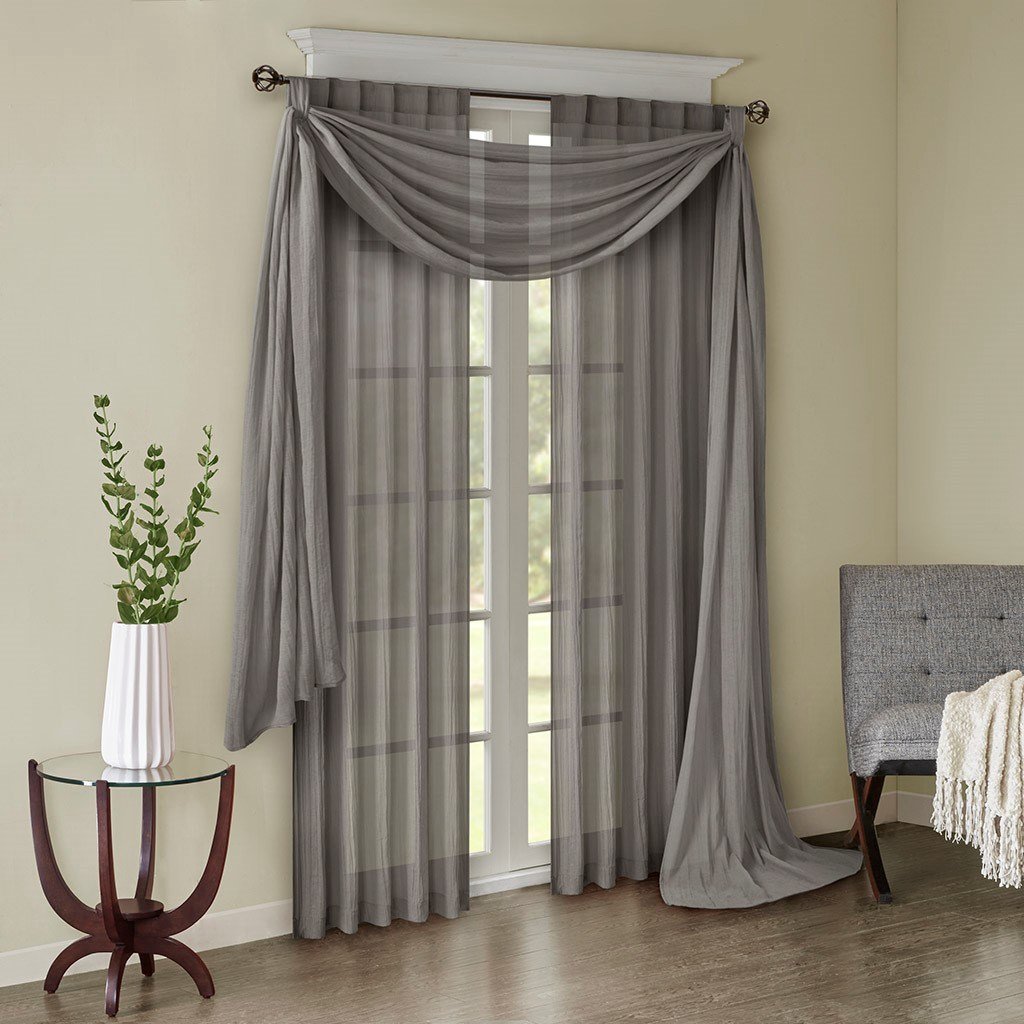 Add a fresh contemporary style to your home with Madison Park's Harper Solid Crushed Window Panel Pair. Made from a lightweight grey sheer fabric, this window panel pair is easy to drape and softly filters the perfect amount of light into your room. Crushed detailing on each panel provides a beautiful texture, adding a touch of modern elegance. Simply hang this sheer panel pair with the rod pocket top or use the back tabs for a more tailored finish to your décor; fits up to 1.25" diameter rod. For a complete look, layer this panel pair with coordinating scarf or prints within the collection for a more custom appeal.