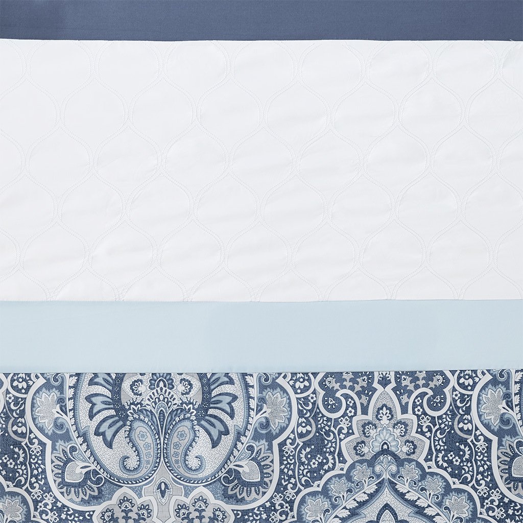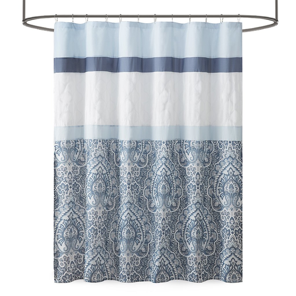 The 510 Design Shawnee Printed and Embroidered Shower Curtain adds a sophisticated flair to your bathroom decor. Featuring a printed and pieced design, this shower curtain flaunts an elegantly intricate pattern in beautiful blue hues for a traditional look. Embroidered detailing adds texture and charm to the design, while an additional lining provides better drapability and added privacy. Made from soft microfiber, this embroidered shower curtain is machine washable and brings a luxurious update to your bathroom.