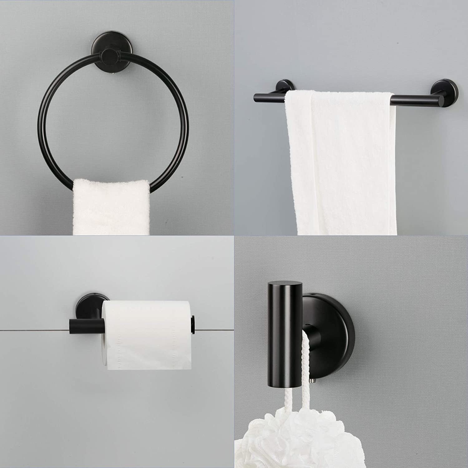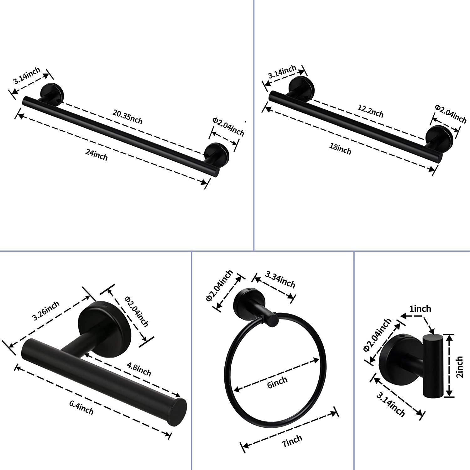 The bathroom hardware set includes: hand towel bar, toilet paper holder, towel ring, 2 multifunctional hooks. They suitable for different style decoration.Select premium SUS 304 as raw material, solid, rust-free, can handle your bath towels without bending over. Delicate finish resists daily scratches, corrosion and tarnishing, always offering a brand-new look all the time.Our bathroom towel holders are not hardware merely for bathroom, they can be your home organizers for a clean definition. Kitchen cabinet, garage door, bedroom ...The hanger will show your its versatility with its perfect size and minimalist style.Designed with clean lines and sturdy construction, the towel bars provide everyday efficiency with style. Unique round shape and concealed mounting hole add more modern elements for your room decor.