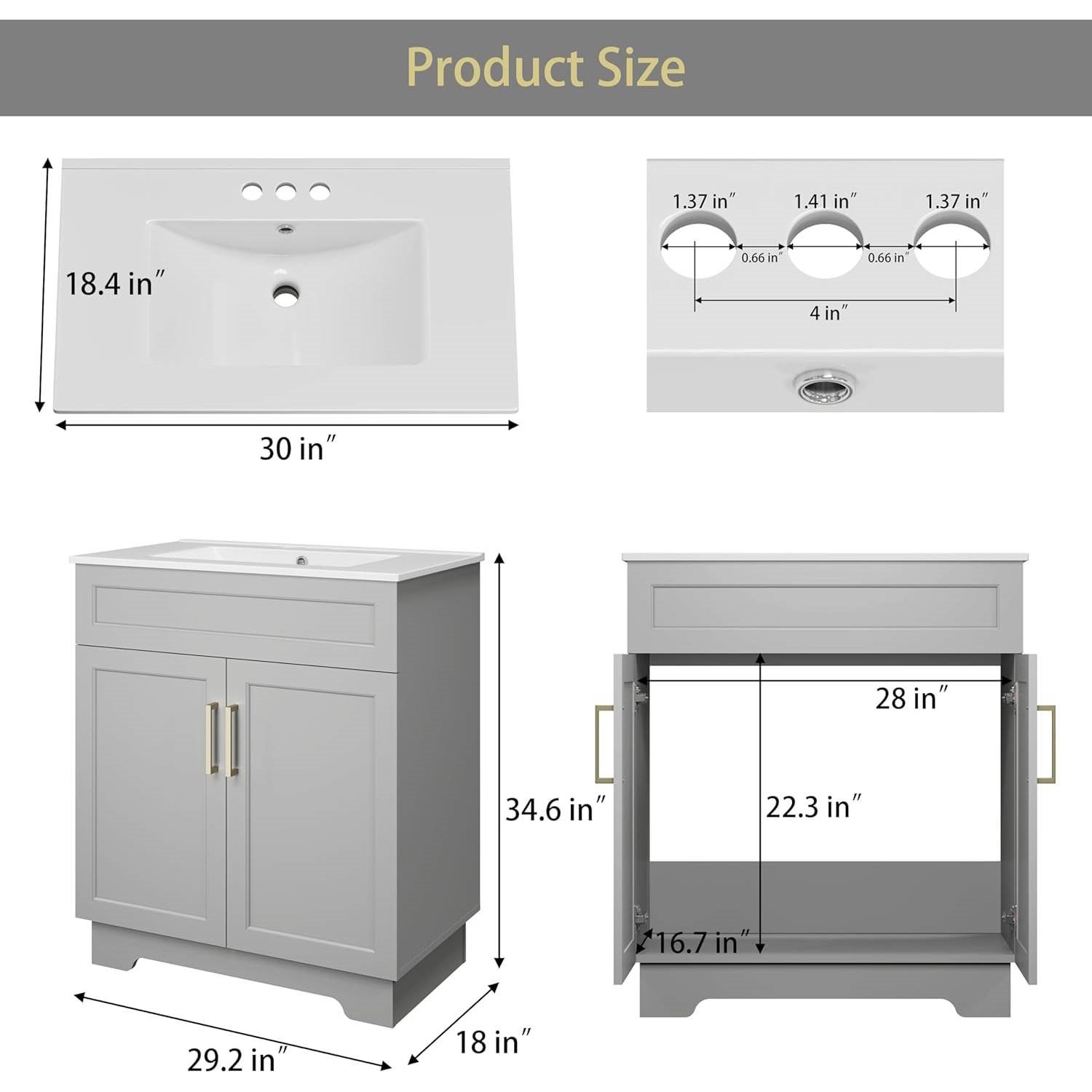 This Modern 30-inch Gray Wood Finish Bathroom Vanity with White Ceramic Sink has been expanded to 30 inches with a larger ceramic sink and storage space. The double door bathroom vanity is the best choice to refresh your bathroom! Assembly takes about 15-30 minutes. The bathroom cabinet vanity comes with some of its components pre-assembled, which greatly simplifies the assembly process and saves time and effort by doing it yourself, no need to spend money on hiring additional assemblers. The bathroom cabinet vanity is made of MDF, an environmentally friendly material, and is assembled with stainless steel hinges. The sink is ceramic, and the vanity unit has a strong and durable wooden frame! The wooden double door 30 inch bathroom vanity with sink and storage reflects a simple and pastoral design. The simple and moody style can be used to decorate various bathrooms. This bathroom vanity is highly ornamental and a good choice to improve your living comfort. Size: 29.2"D x 18"W x 34.6"H. All necessary accessories and detailed assembly instructions are included (Faucet and downpipe not included). Self-assembly is required. If you have any queries during assembly and use, please contact us and we will get back to you within 24 hours!