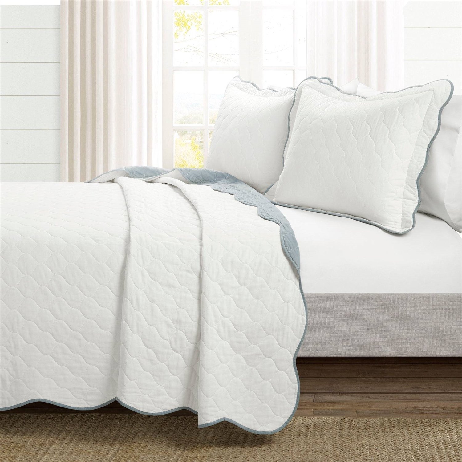 Home > Full/Queen White Blue Scalloped Edge Reversible Thin Light Quilt Set