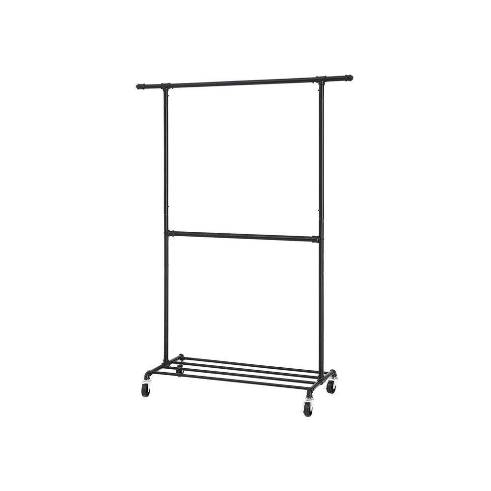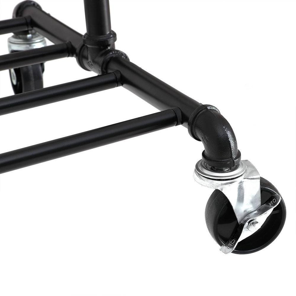 The rustic and industrial design makes this Modern Industrial Style Black Powder Coated Garment Rack with Bottom Hanging Rod a decorative piece for clothing stores, boutiques or retail businesses. With center rail adjustable at 4 heights, it is perfect for keeping long or short garments in an organized way. The wheels make the clothes rack incredibly practical so you can easily transport clothes around your store or studio. Works as a clever solution to store all your piled up clothes without taking up a large amount of floor space. This super cool and stylish pipe garment rack works well in a loft apartment with no closet space. For exceptional built quality, high weight capacity and convenient mobility - look no further than Industrial Pipe Double Rail Garment Rack. No matter if you have a cool rustic apartment or a feminine home, this trendy industrial-inspired clothes rack will be a statement piece, also displays garment stylishly in boutiques or secondary markets. Premium metal tubes ensure stability and superior strength with a 242 lb total weight capacity; for hanging your heaviest winter jackets or chic cocktail dresses, this clothing rack is a must-have. Adjust the middle rail among 4 different heights (while the total height remains fixed), hang coats or long dresses on the top rail, and ready shoes or bags on the bottom shelf—this rack keeps everything in one place. Slide this clothes rack with 4 wheels to a dressing mirror for checking out your outfit, lock it in place when you complete your morning routine, or roll it around backstage for handling numerous costume changes. Assembly shouldn’t be an annoying task—with clear instructions, labeled parts, and assembly tools included, you’ll have this clothes rack set up before you know it.