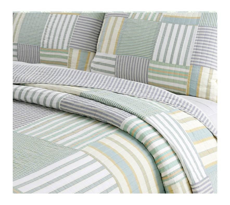 Create a beautiful tranquil welcoming place within your home with this Twin Size Soft Reversible Patches 100% Cotton Quilt Set. The balance of stripped patterns and calming colors tones are a perfect combination. A variety of horizontal and vertical stripped patterns in various shades of green, yellow, blue patchwork together in a square patchwork balance together. This cotton quilt set is reversible so that you can quickly and easily change the look of your room. Made completely of 100% Cotton. Easy-care machine-washable cotton material, this quilt set is easy and quick to launder.