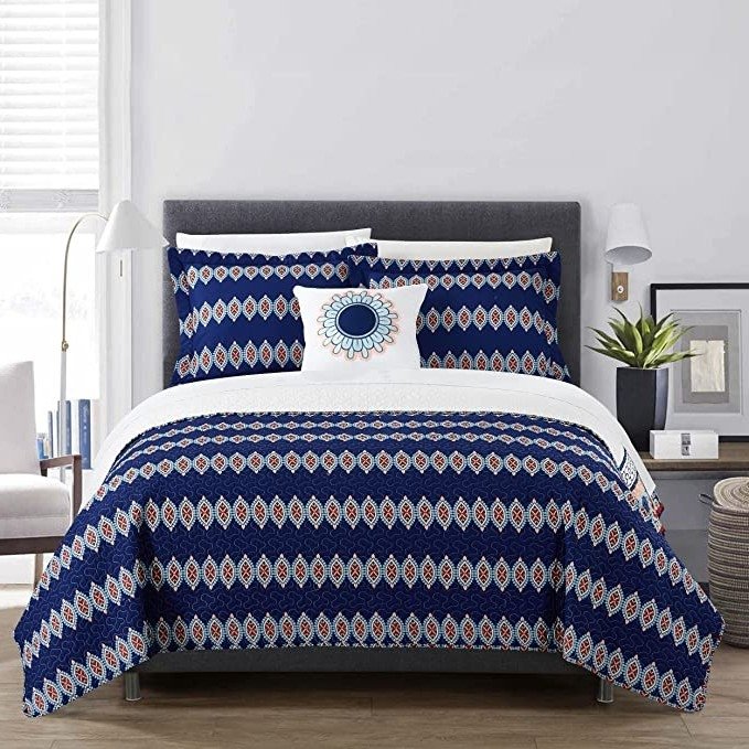 Relax in sift luxury with this 4 Piece 100% Cotton Blue White Boho Geometric Reversible Quilt Set - King. This quilt cover is made with premium quality fine combed super soft prewashed 100% cotton 200 thread count. This quilt is filled with cotton (80%) and synthetic down alternative filling (20%). The reversible quilt cover is perfect for spring, summer, or fall nights and southern states all year round. The set is made with strict quality control and comes with a king size quilt cover, 2 king shams and a decorative pillow.