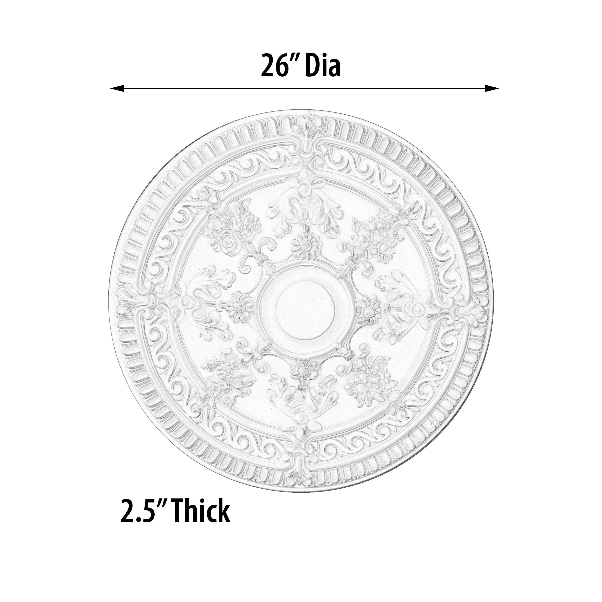 At a diameter of 26 inch this beautiful ceiling medallion features flower scroll details finished in white. The decorative ceiling medallion features a 1.5inch center space that can be cut out for use with chandeliers, fans, and other light fixtures. All the details in the ceiling lighting accessory are raised providing the medallion with rich depth. The ceiling medallion ships prefinished in white but can easily be painted to match your interior. Light weight, these decorative ceiling medallions are precision cast using durable polymers that are No shrinking and 100 percent waterproof. Installation can easily be done with architectural adhesive and finishing nails. Instantly provide your ceiling space or walls with rich architectural details that are long lasting, maintenance free, and add value to your home giving you the look of expensive custom crown molding trim work at an affordable price.