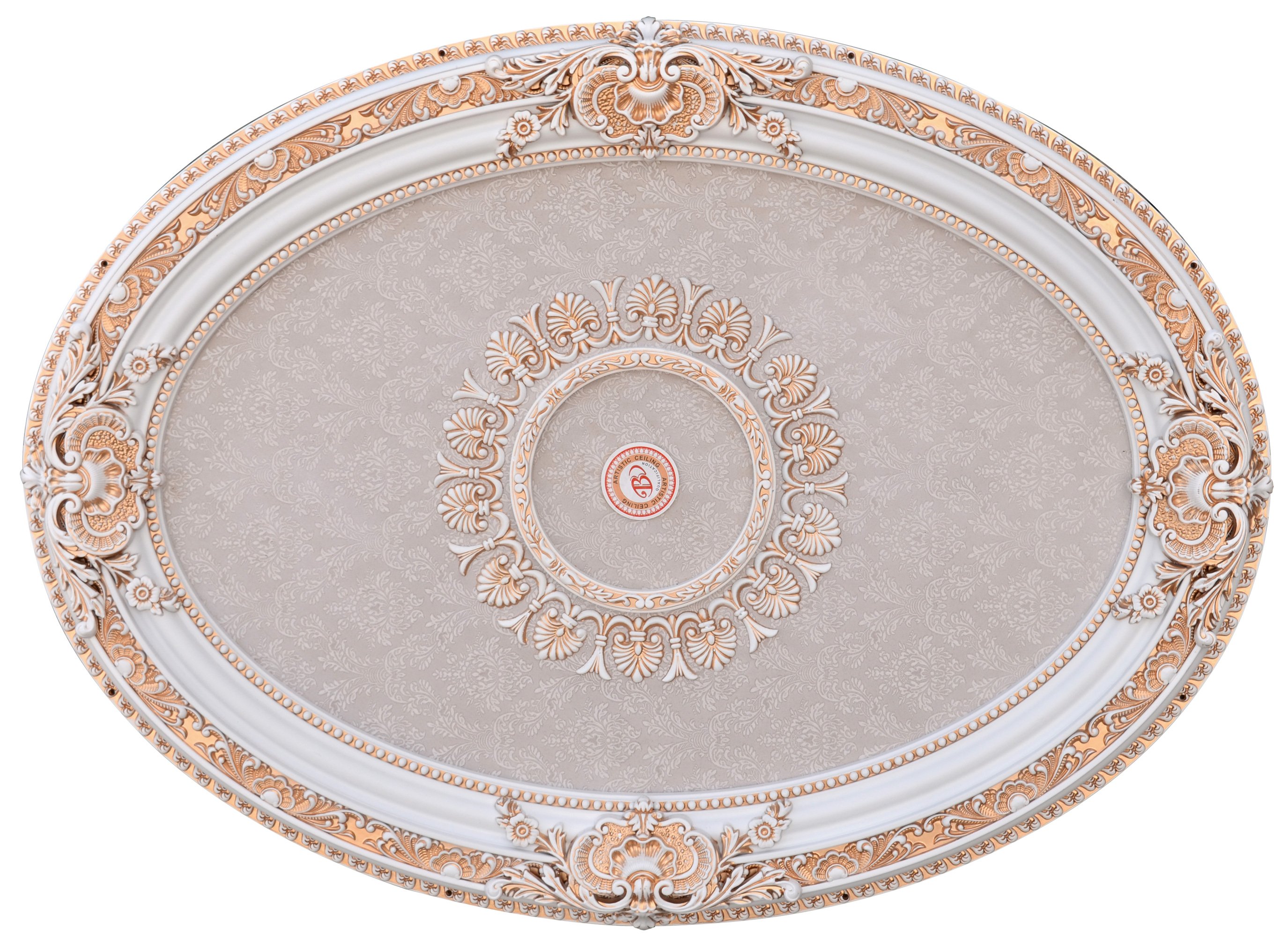 The 43 inch x 31.5 inch Blanco Oval Ceiling Medallion is an elegant lighting application for fine homes. French inspired this ceiling lighting accessory comes prefinished in beautiful white with gold accented details with a cream slightly raised floral pattern center panel. A 1.5 inch center hole is provided for easy installation of the ceiling molding with chandeliers and fans. Transform otherwise vast open plain ceiling spaces with the unique architectural detail this decorative ceiling medallions provides. Light weight, this decorative ceiling medallion is precision cast using durable polymers that are No shrinking and 100 percent waterproof. Installation can easily be done with architectural adhesive and finishing nails. Instantly provide your ceiling space or walls with rich architectural details that are long lasting, maintenance free, and add value to your home giving you the look of expensive custom crown molding trim work at an affordable price.