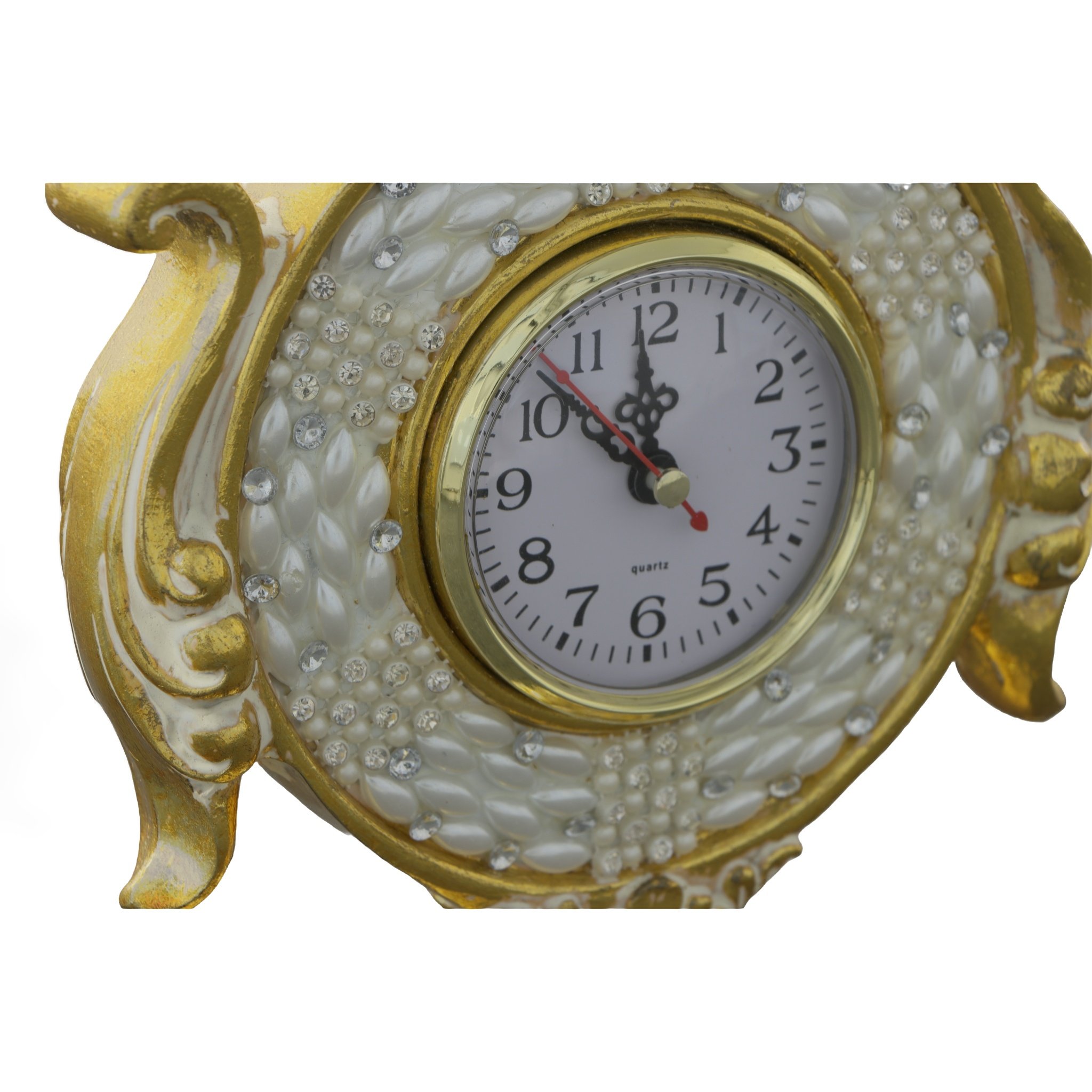 A 14.5 Inch Tall Aurora Clock on Stand. Boasting hand applied patterns with hundreds of faux pearls and intermittently placed Rhinestones. Finished in an Italian soft metal gold finish. Hand Cast in resin with a removable metal faced battery operated clock mechanism. Batteries not included.
