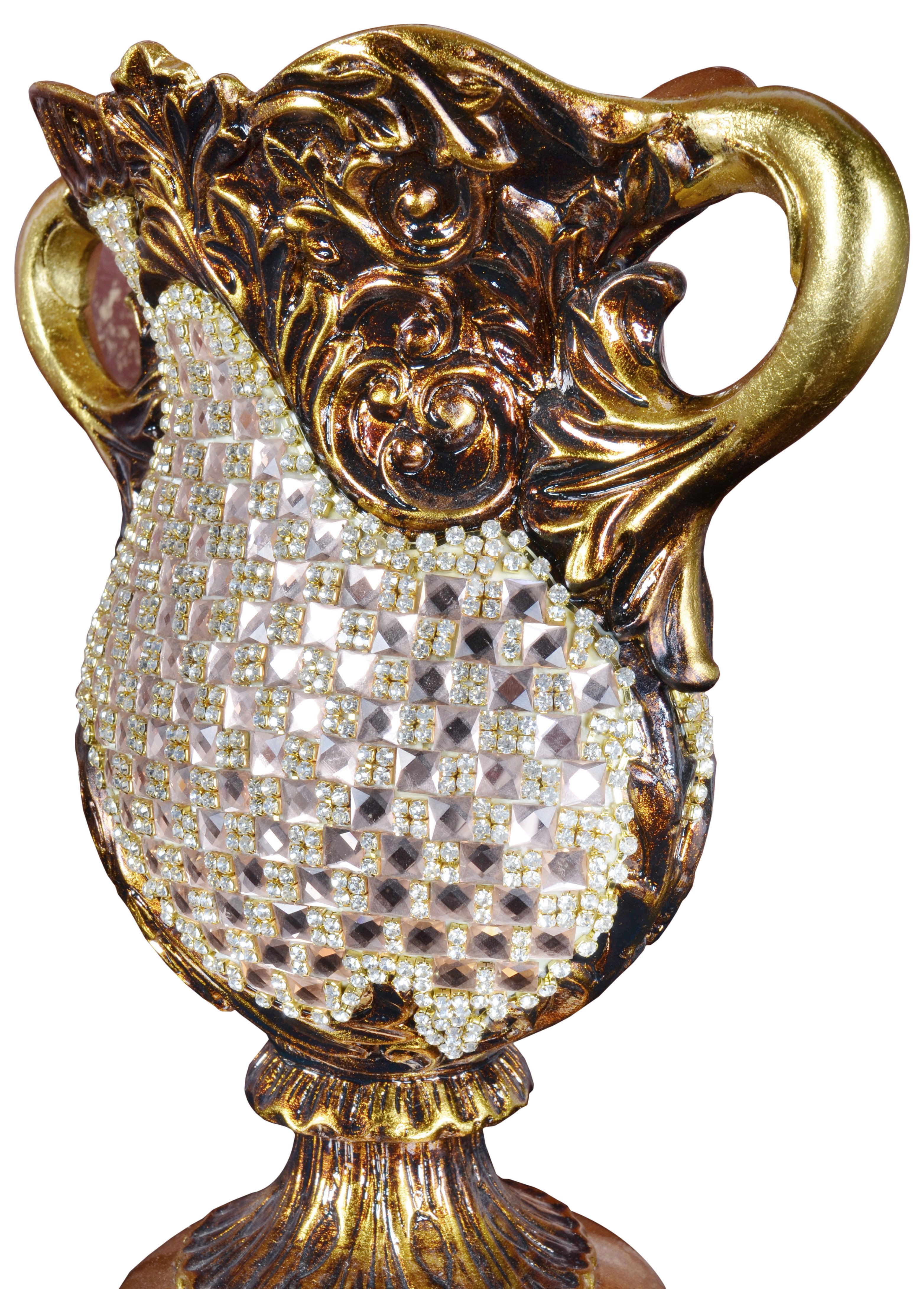 The Old World Rose Crystal Wide Vase 13 Inches Tall is a very elegant vase on a smaller scale. It is beautiful standing empty or can be filled with Flowers. It is a design reminiscent of a time of elegance and romance. The vase is Hand cast in durable polyresin. It features a hand finish of burnished antique gold elevated to a more luxurious place with hundreds of individually hand applied elements of rose and clear rhinestones intermittently set. The contrast and design create a very striking effect on this unique handcrafted functional decor item. Consider ordering a pair for Balance or Symmetry.
