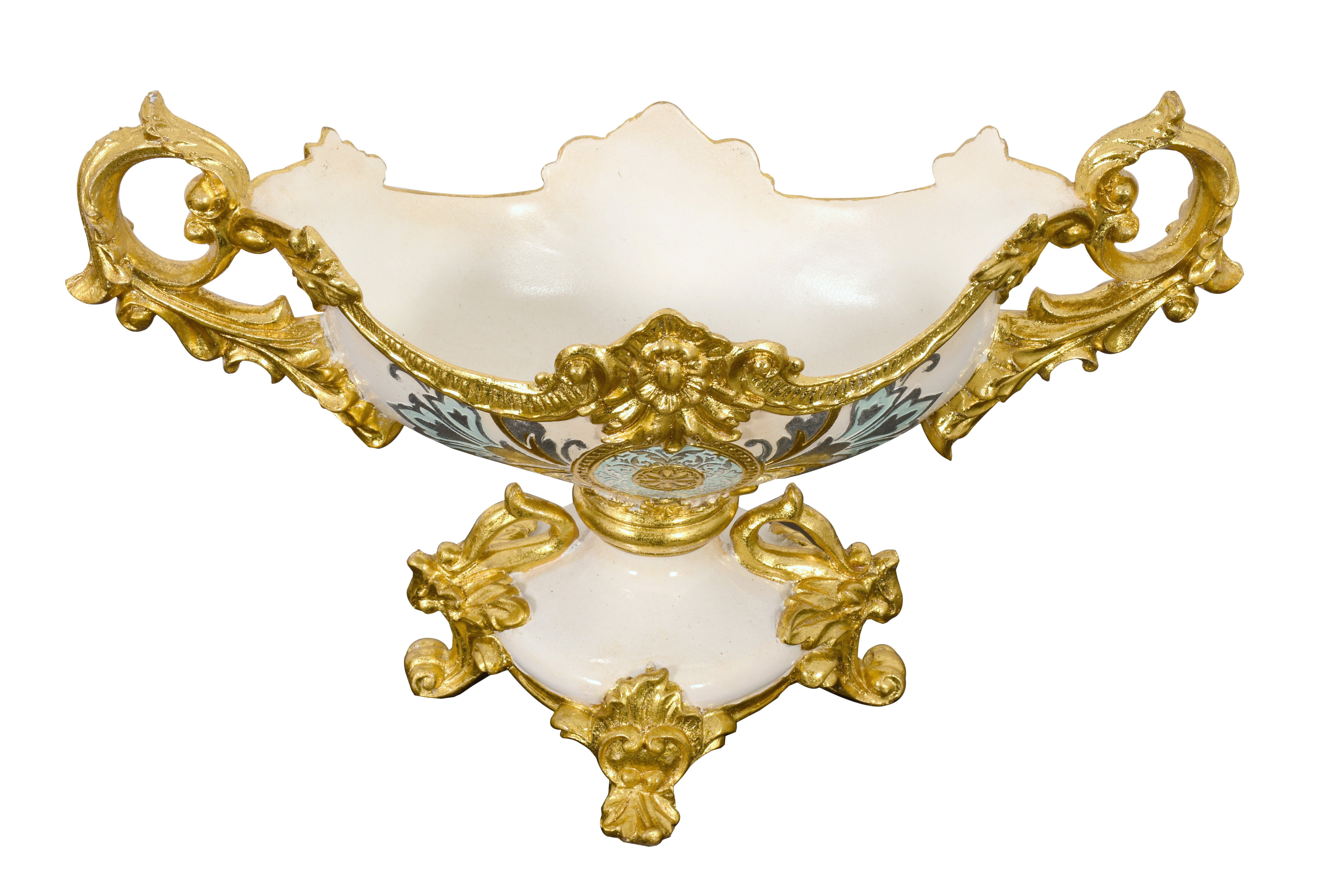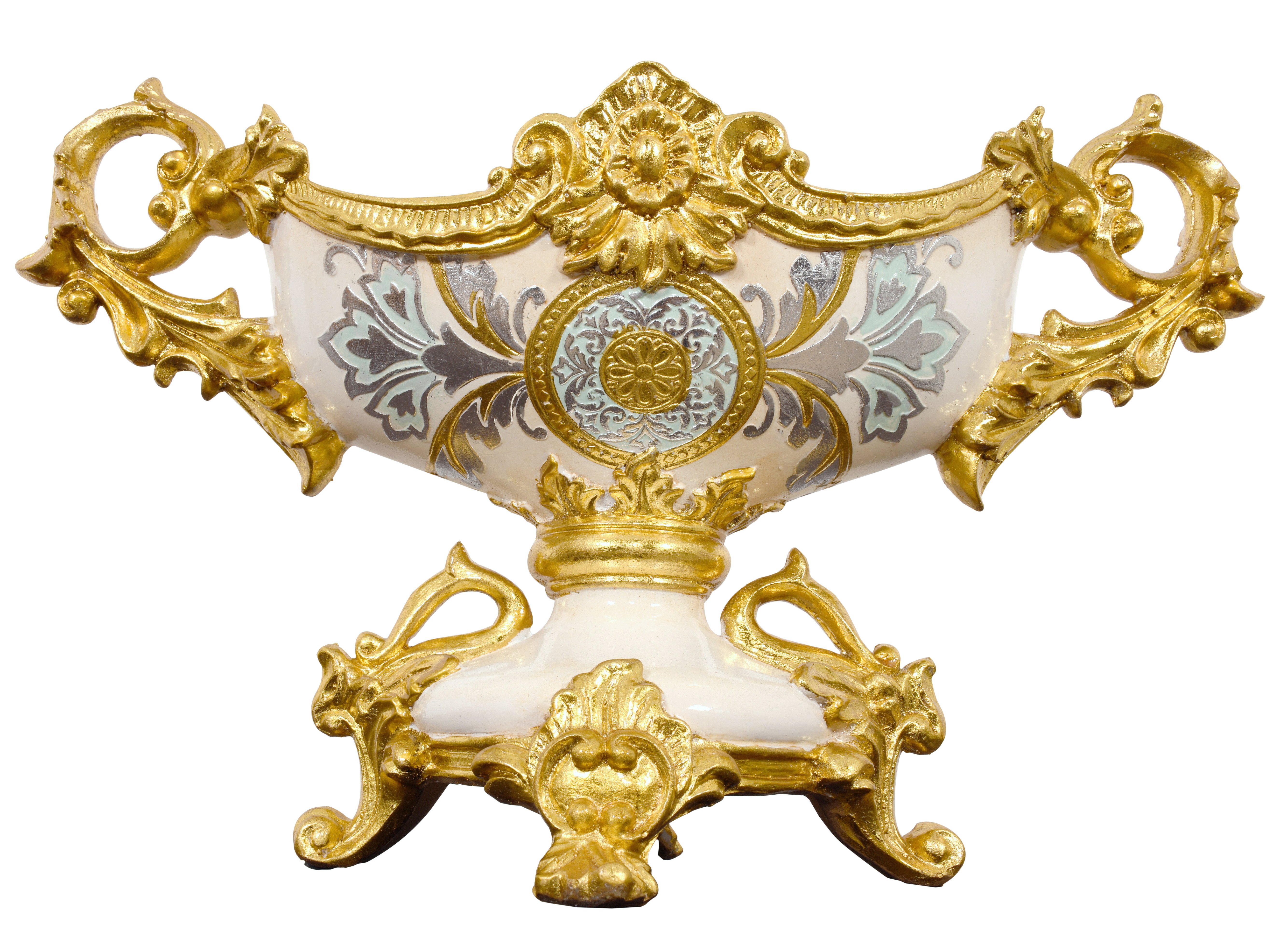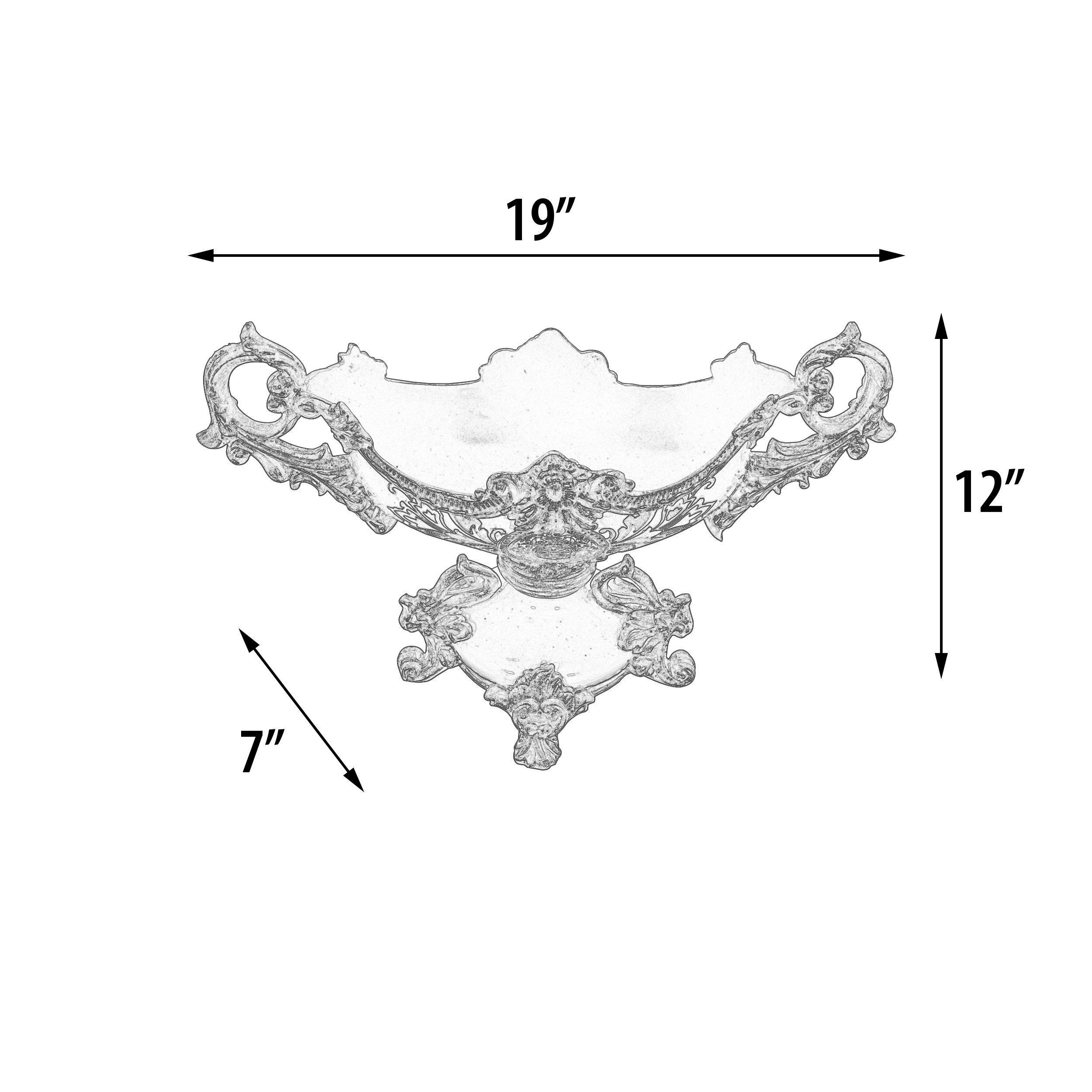 The Celine Collection is one of the most beautiful traditional designed accessory groups. The Celine Crowned centerpiece measures 19.1 inches wide x 7.1 inches deep x 12 inches tall. The Hand finishing is elegant, offering a subtle contrast of white, blue, silver, and gold. Versatile as a centerpiece for an arrangement or as a decorative object. Sold separately but often used with a pair of Celine Crowned Urns to create a complete table or mantel set.