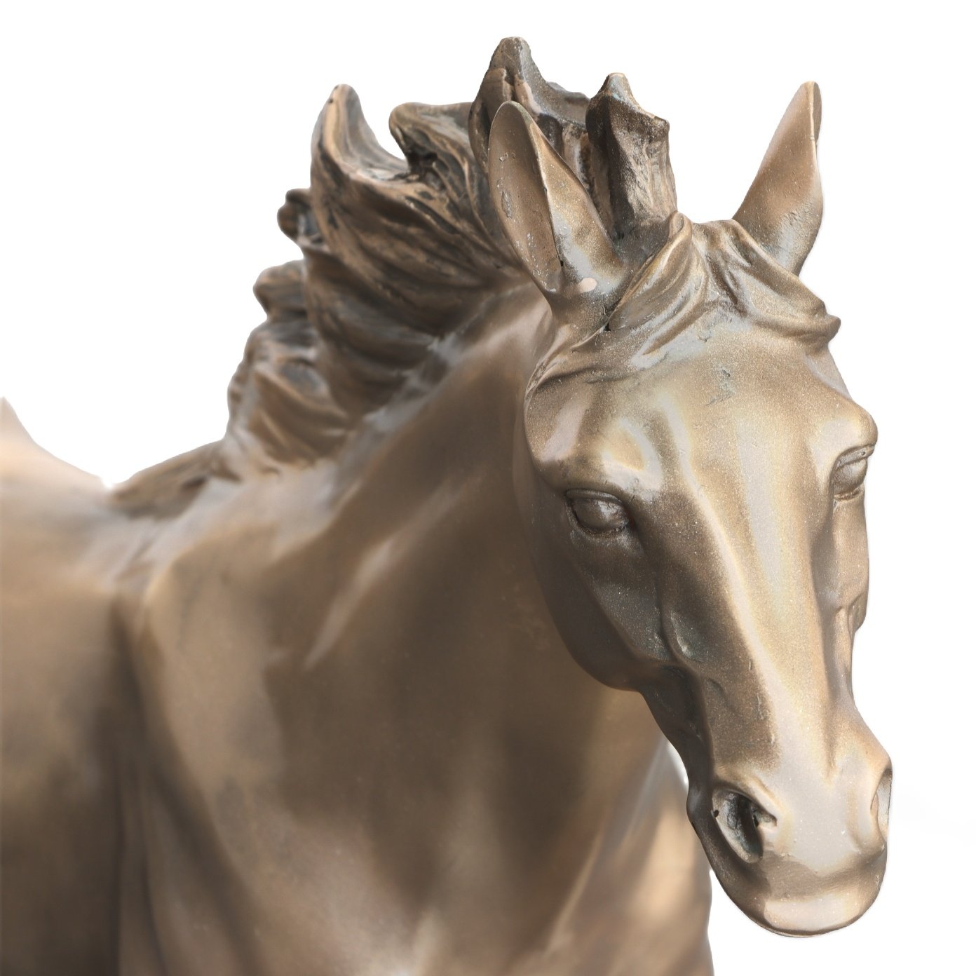 Our Bronzed Galloping Horse at 21.25" wide x 4.75" deep x 14.75 " tall, is from our popular Platine Metal Series. The original design was Artist sculpted and then hand cast in Polyresin. It features our special and rich Platine metal plated finish. A finish that enables the artists to burnish and polish the details creating a very expensive looking yet affordable decorative art sculpture.