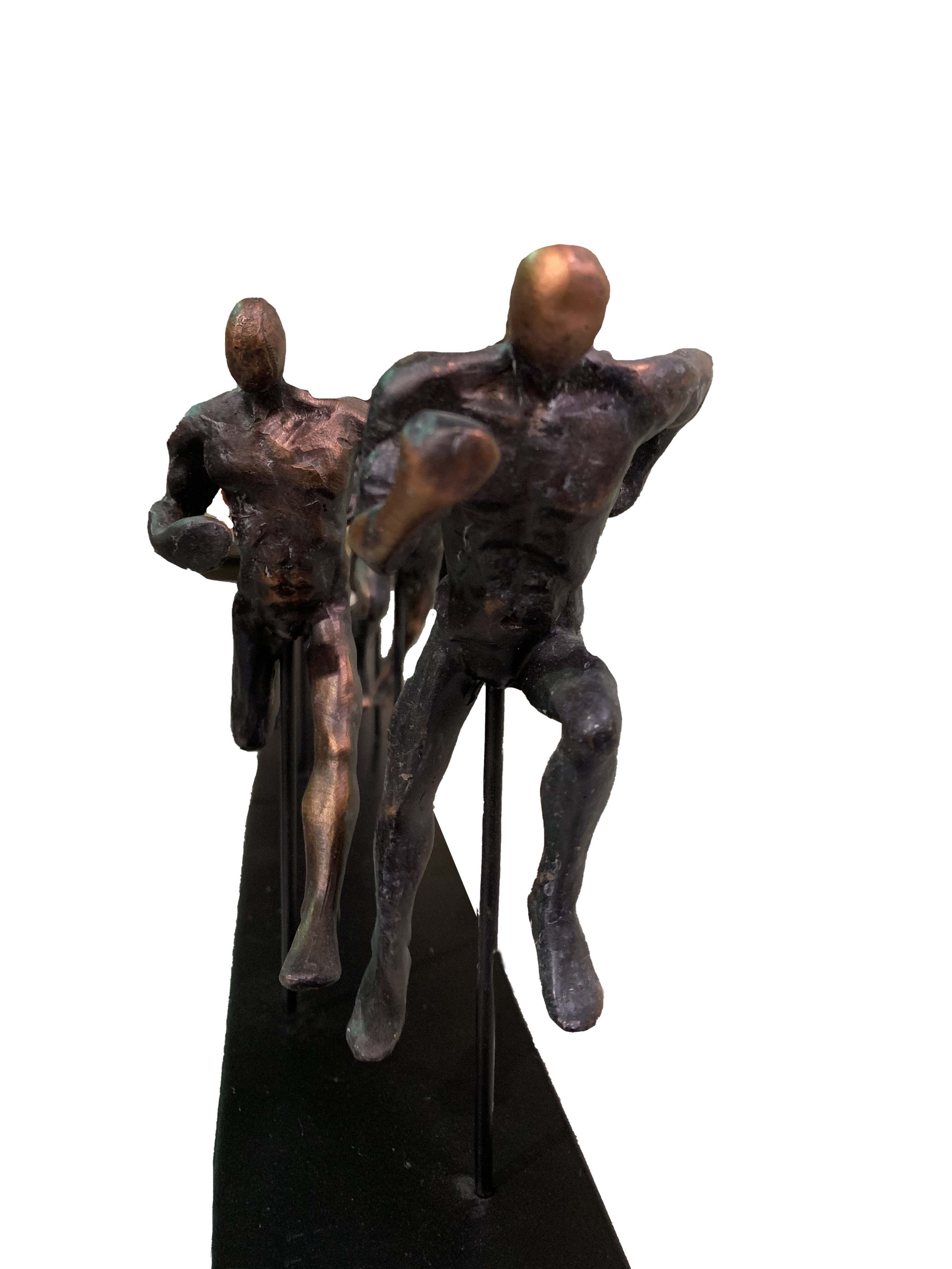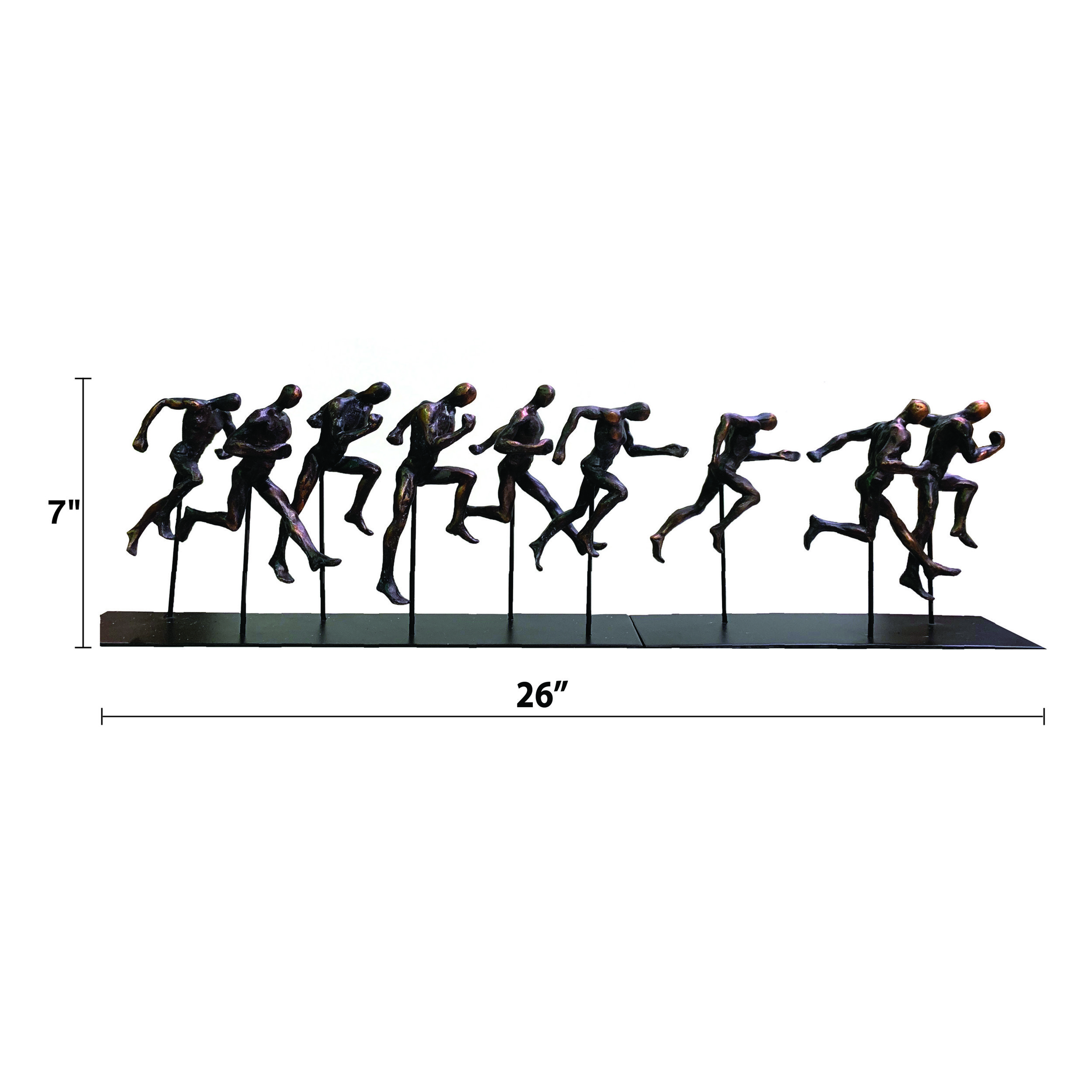 Our popular Running Men on Metal Stand Set of 2. This offering features 2 groups of sculpted men runners. Created in 2 sections to allow more options in its display. The set is current in styling and offers a view of action and movement in its design. A popular choice with our active on the go active customers. The individual runners are hand cast in durable Poly resin and mounted to an iron stand. Consider combining it with other sport theme decorative creations from AFD Home. No Assembly Required
