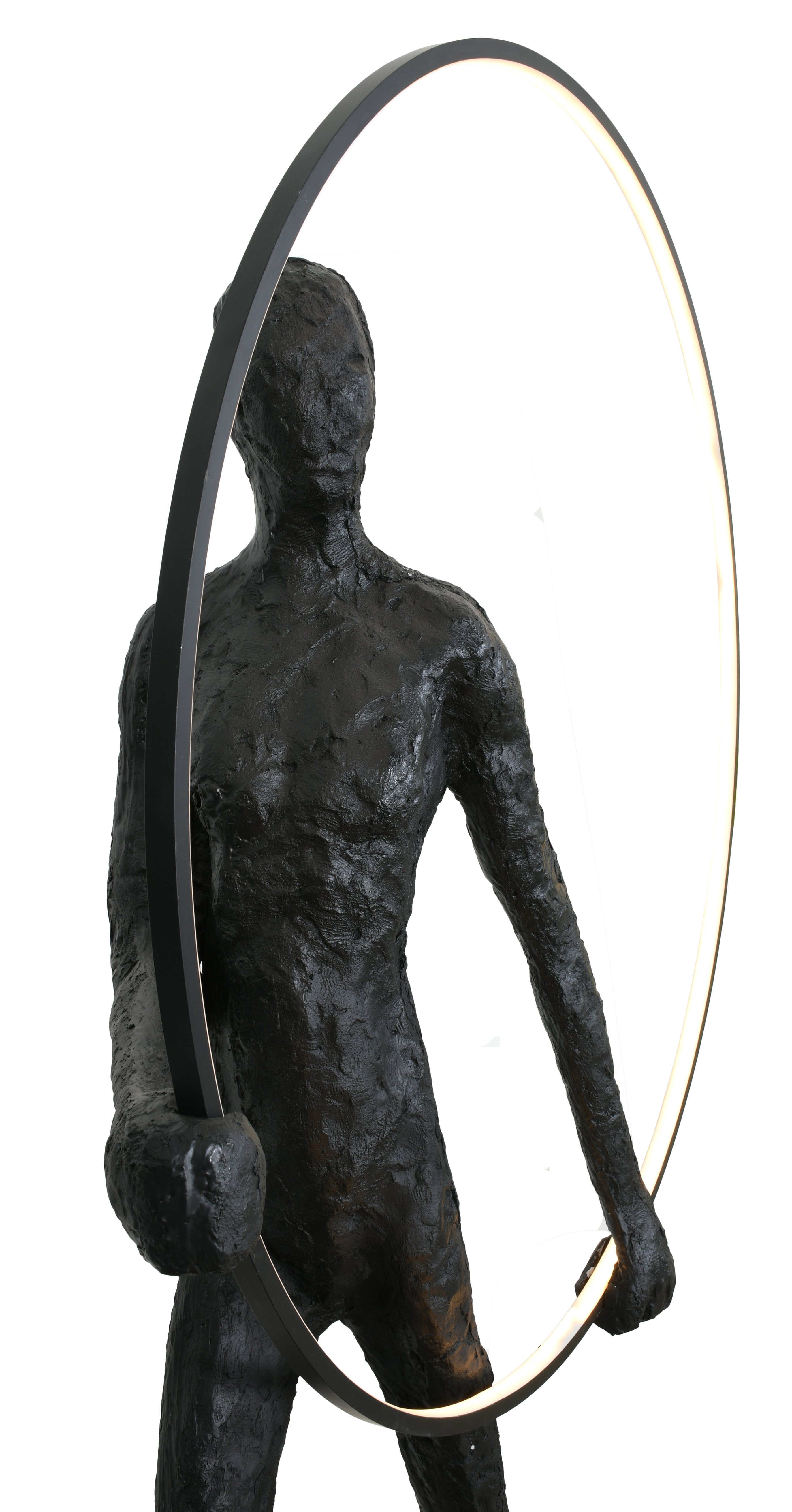 A new Artist created Modern Sculpture of a Man Holding an Illuminated Light Ring. A functional art creation that makes a presence in Design. Life Size, measuring 44.00 x 18.00 x 82.00 Tall. You will like that the LED Light is Included and No Assembly is Required. Hand Made from the artistsoriginal using durable Fiberglass. The texture replicates the artists hands in the original clay master. The special finish gives it a modern bronze affect.