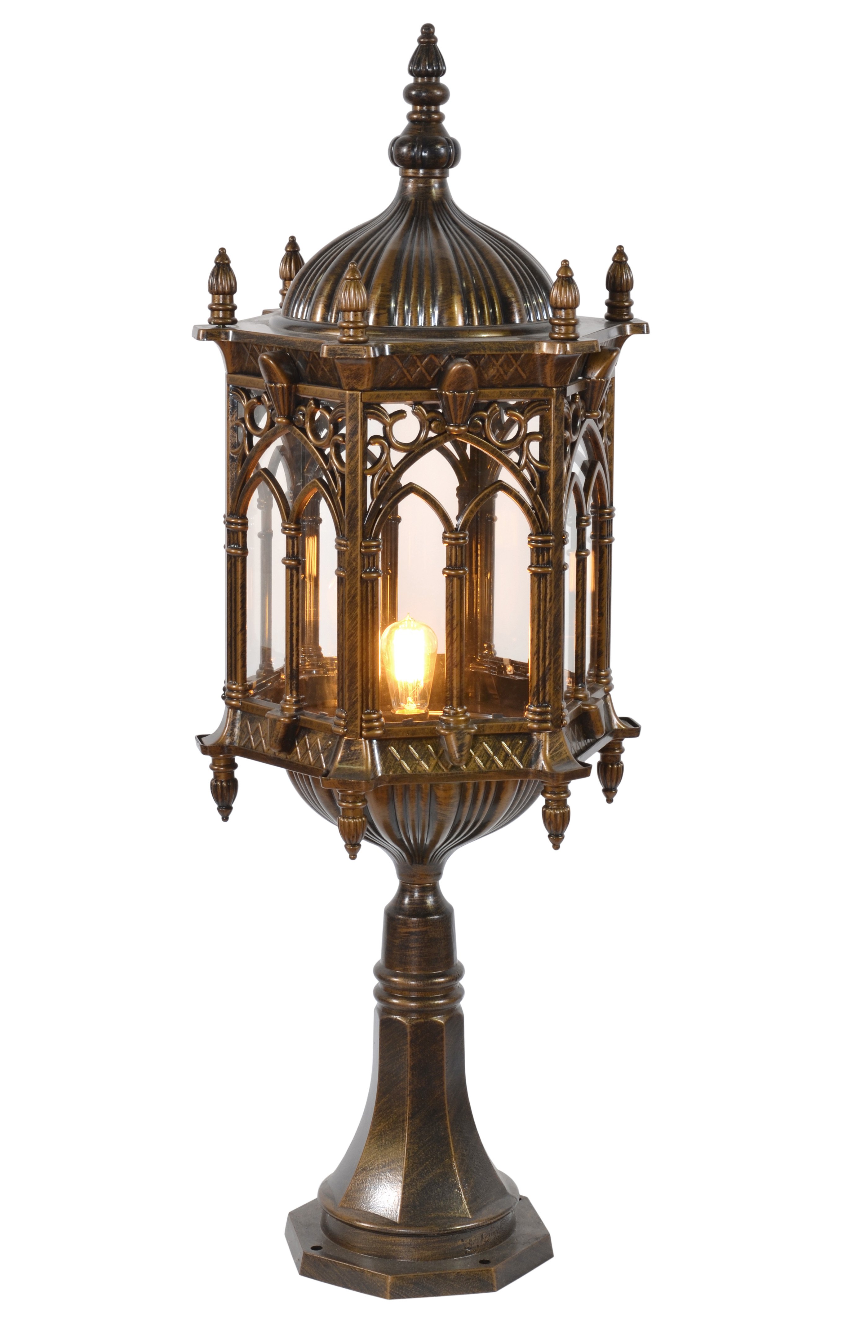 The Gothic Column Lamp is elegance in medieval architecture. Featuring a rust proof cast aluminum composition with fantastic details of spires scrolls and archways surrounding the glass light enclosure. Pre-wired for ease of installation. Main electrical wiring is necessary.