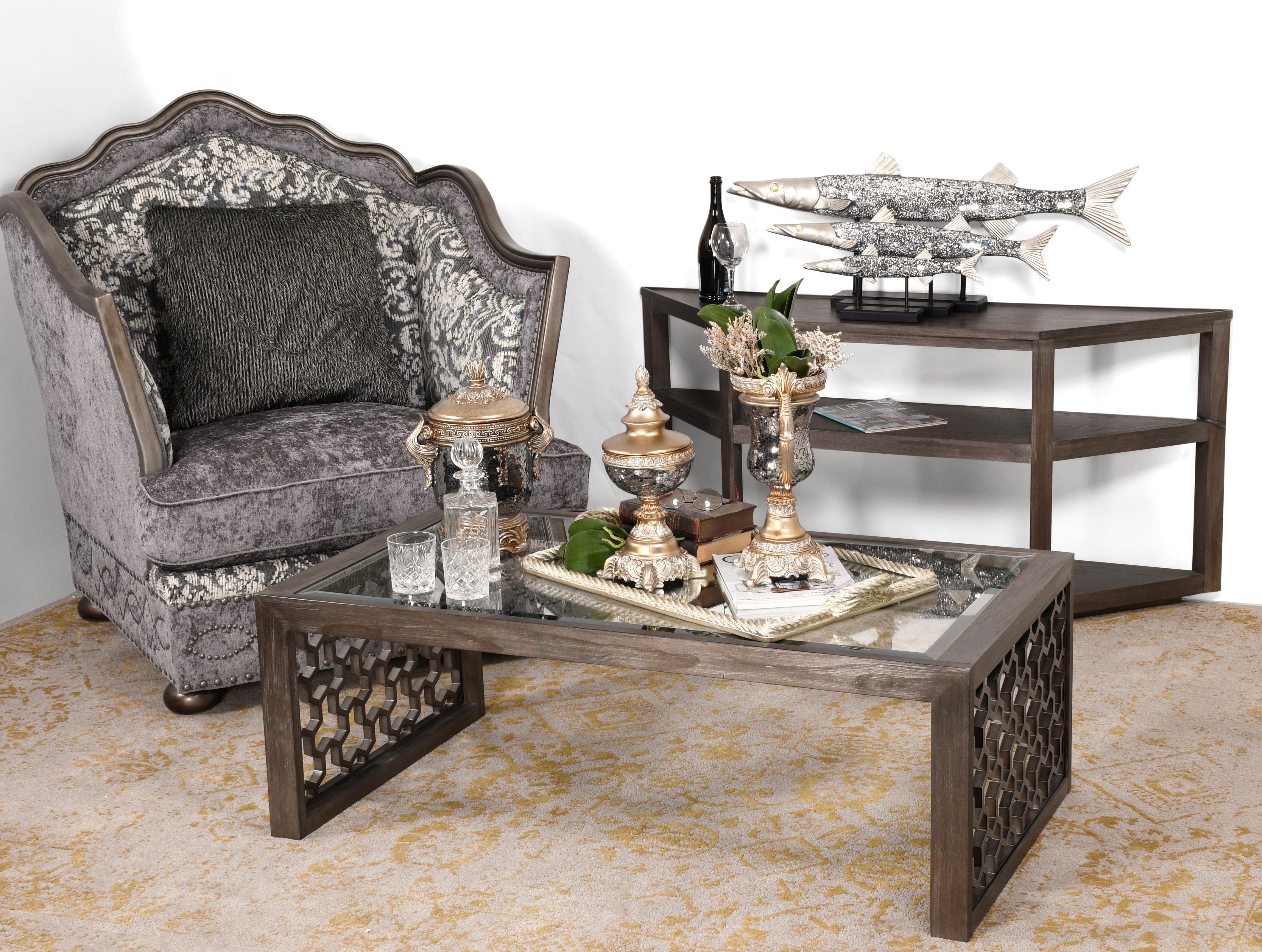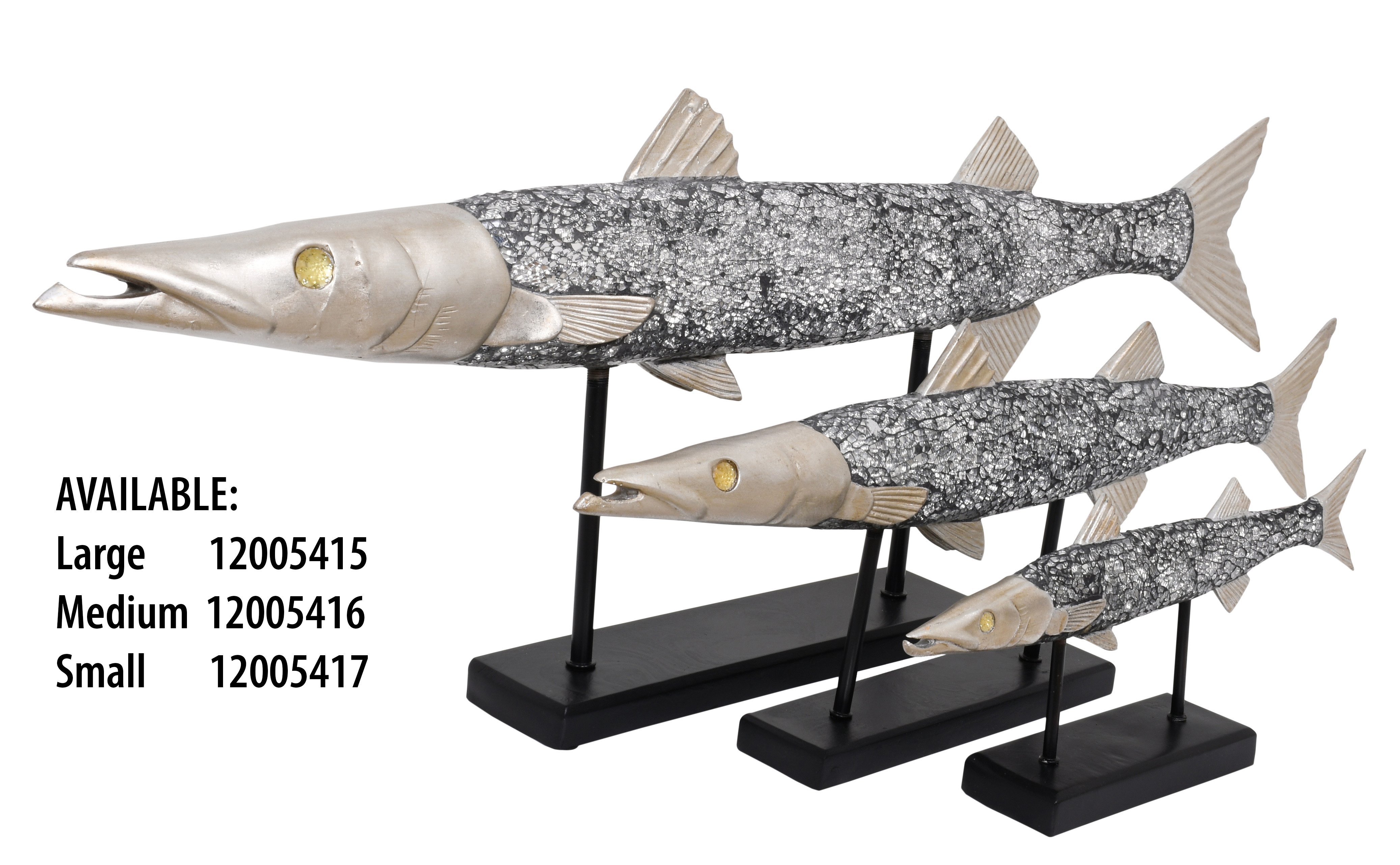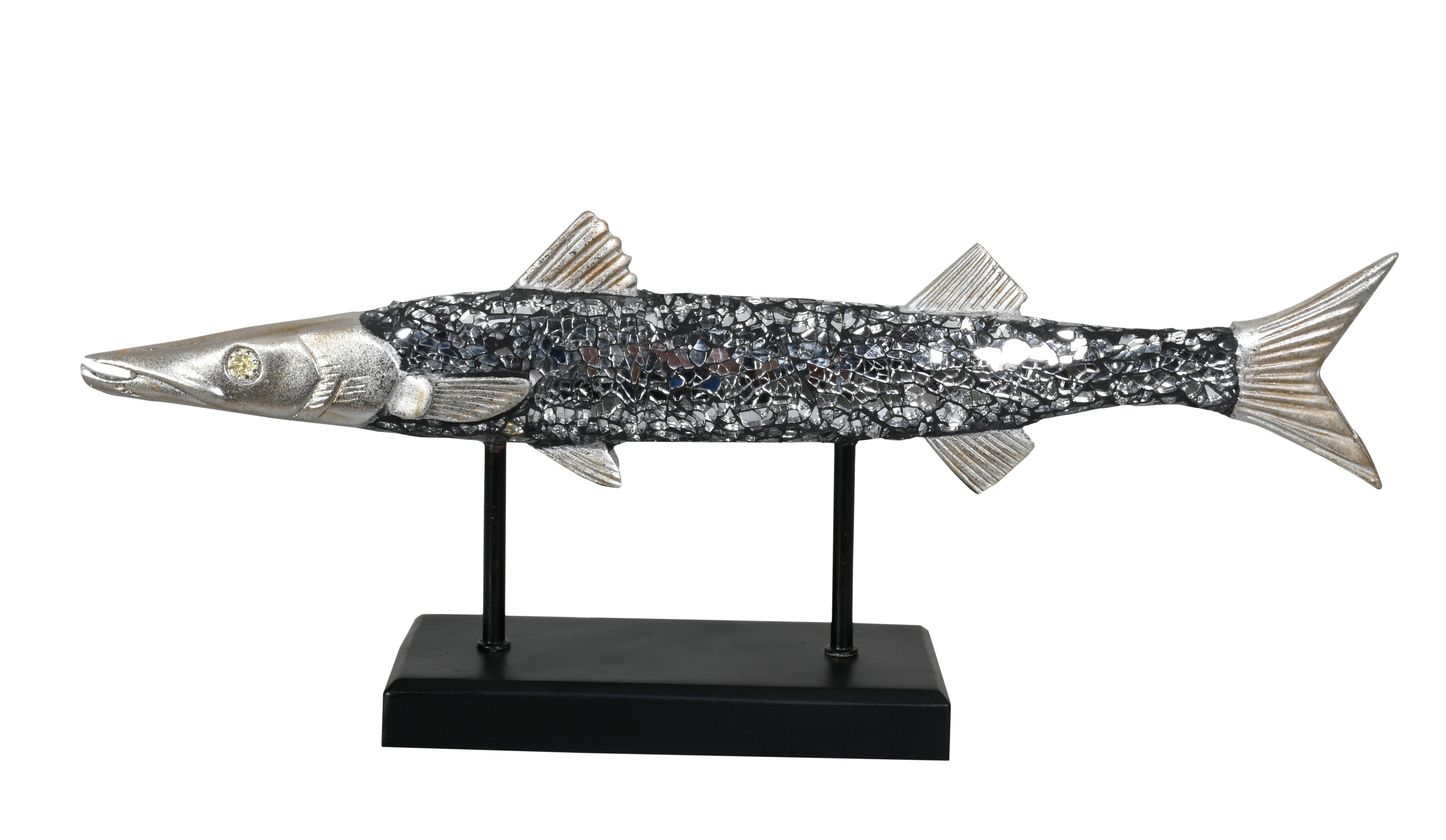 An artistic sculpture featuring a fish on a stand in a modern artistic interpretation featuring micro mosaic mirrored elements surrounded by a silver chiffon finish with golden hues. The item is hand cast in resin with iron stand atop a stable base and completely hand finished.