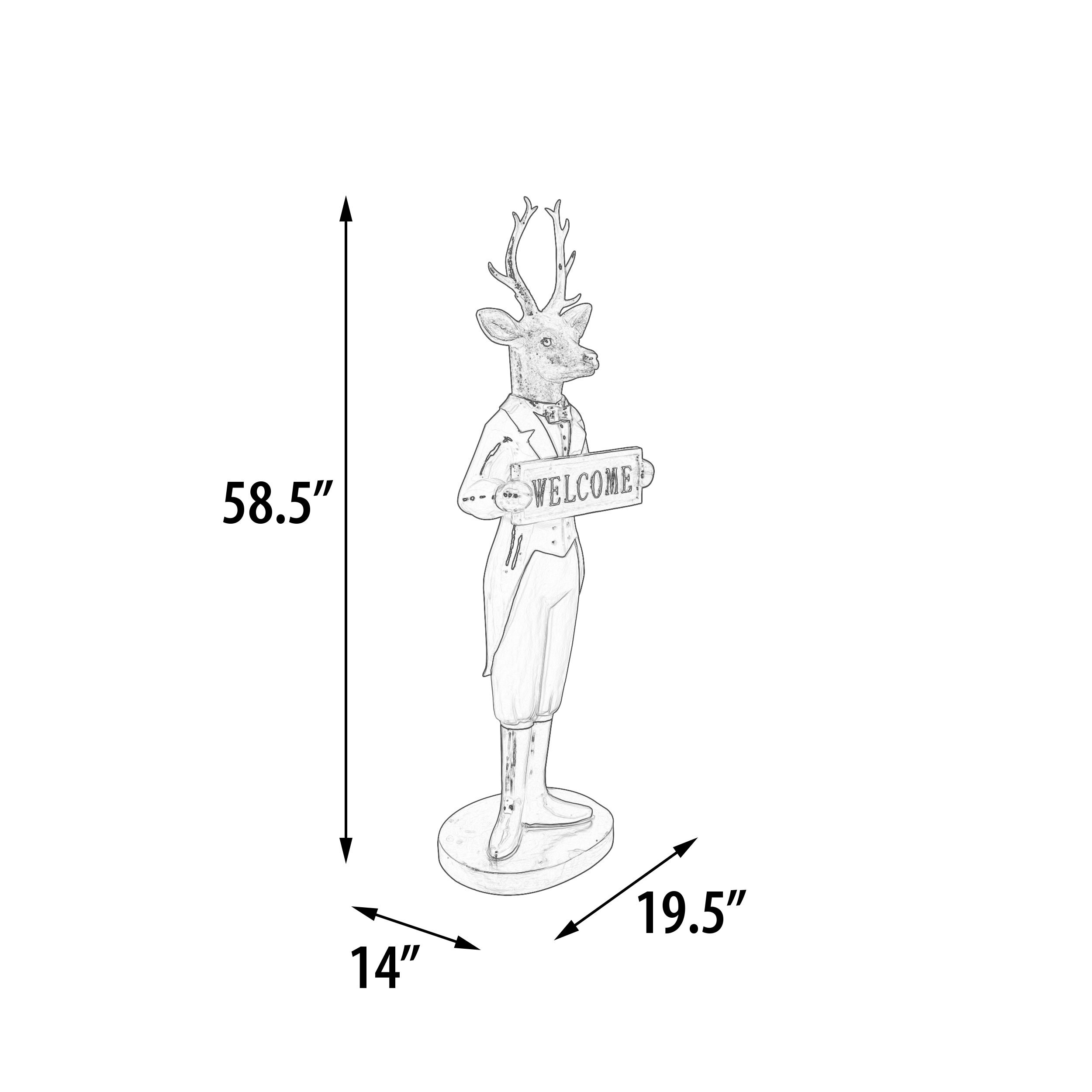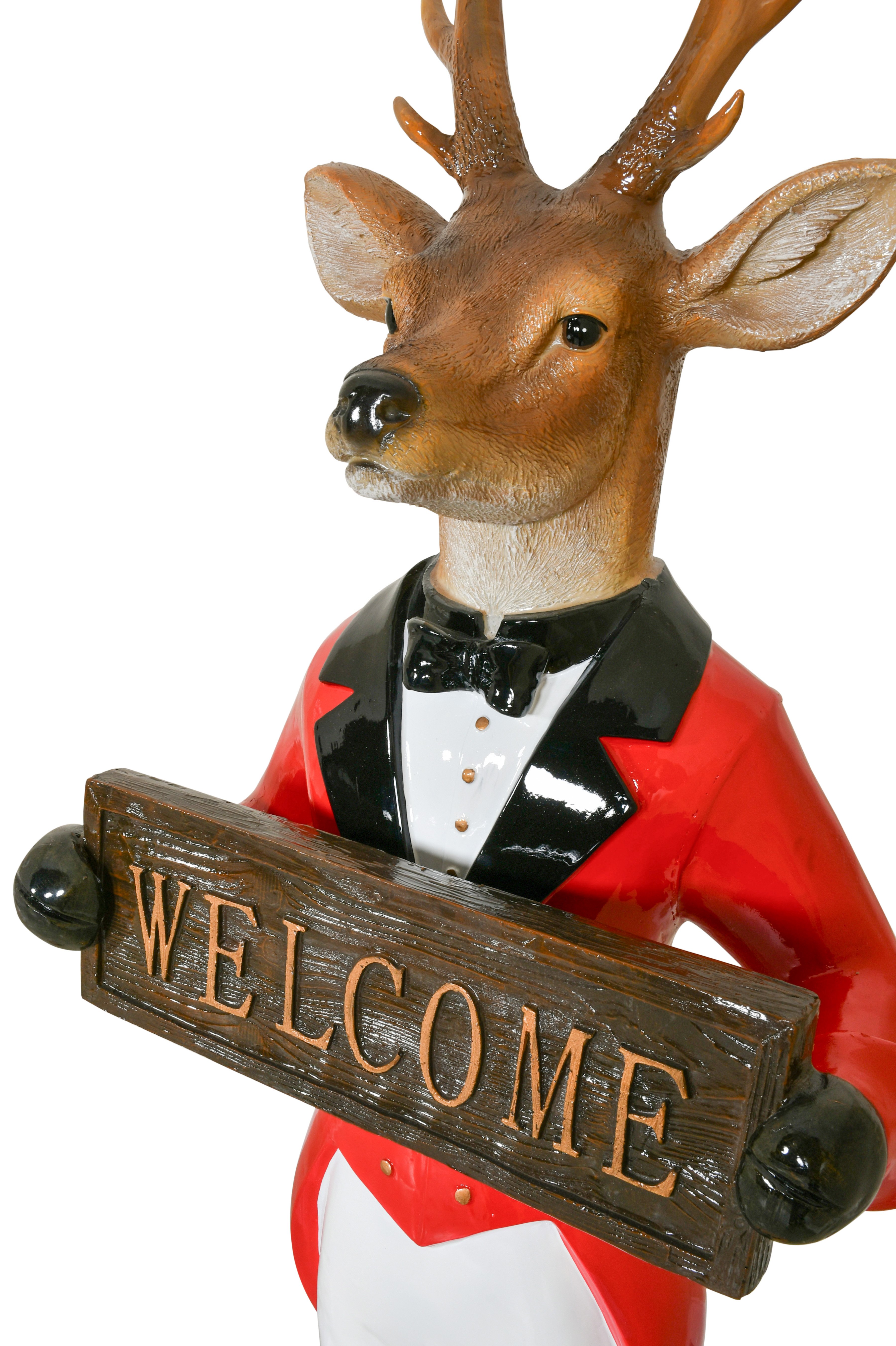 Standing at an imposing height of 58.5 inches, this statuette is a fusion of the animal kingdom and human refinement. A stately deer head, complete with a full rack of antlers, is seamlessly set atop a dapperly dressed figure in a bright red jacket, crisp white pants, and polished black boots. This unique creature, holding a wooden "Welcome" sign, bridges the gap between the whimsy of nature and the cultivated touch of human hospitality. It's an enchanting addition to spaces that appreciate a blend of the outdoors with a sophisticated twist, serving as a memorable greeter for homes, upscale lodges, or specialty shops seeking to make a statement.