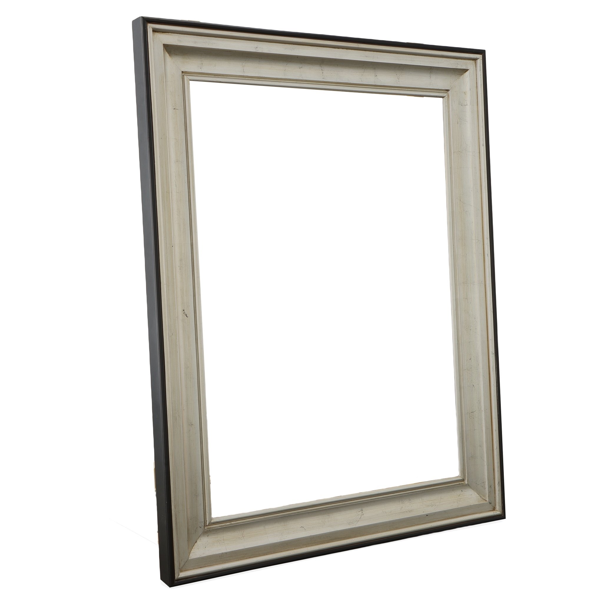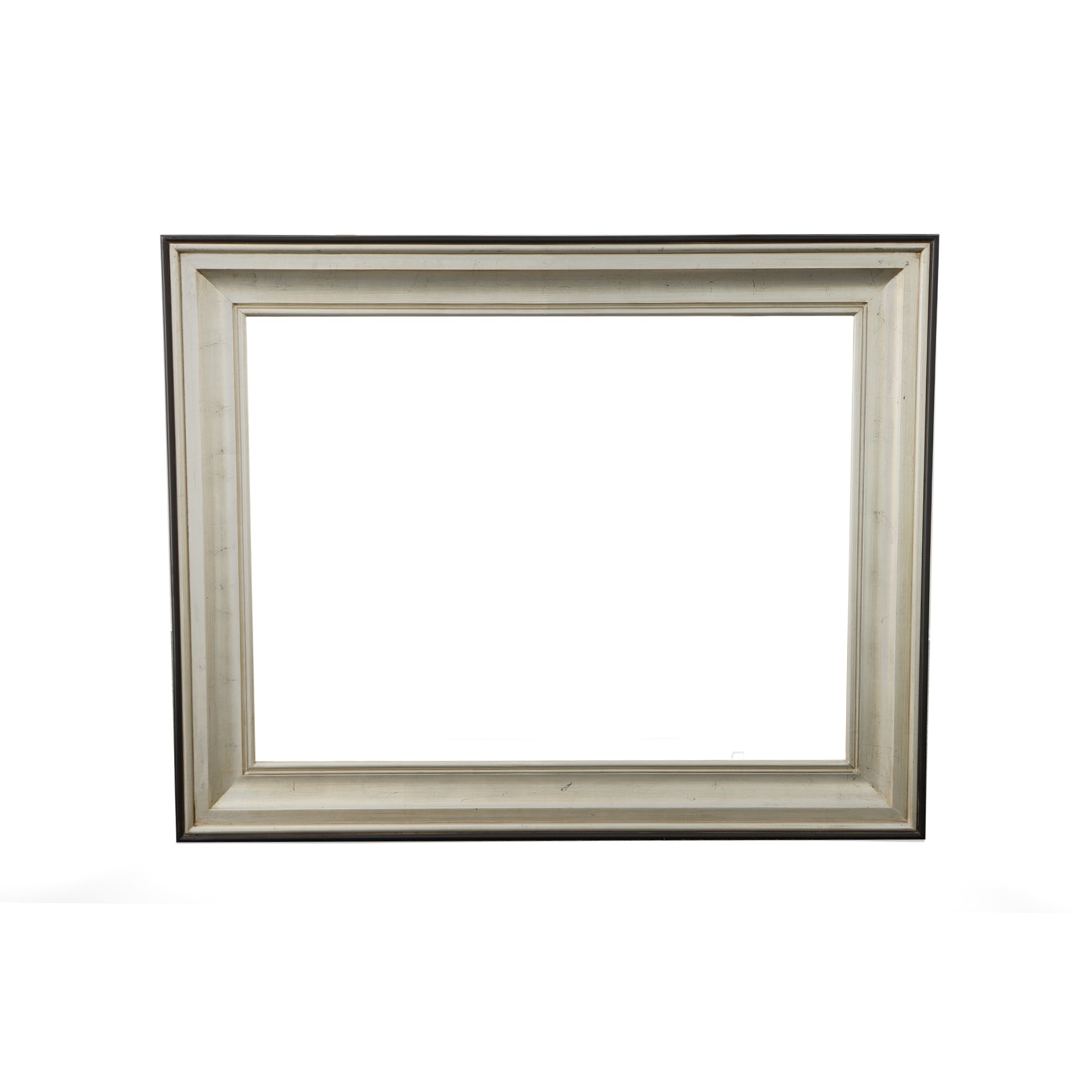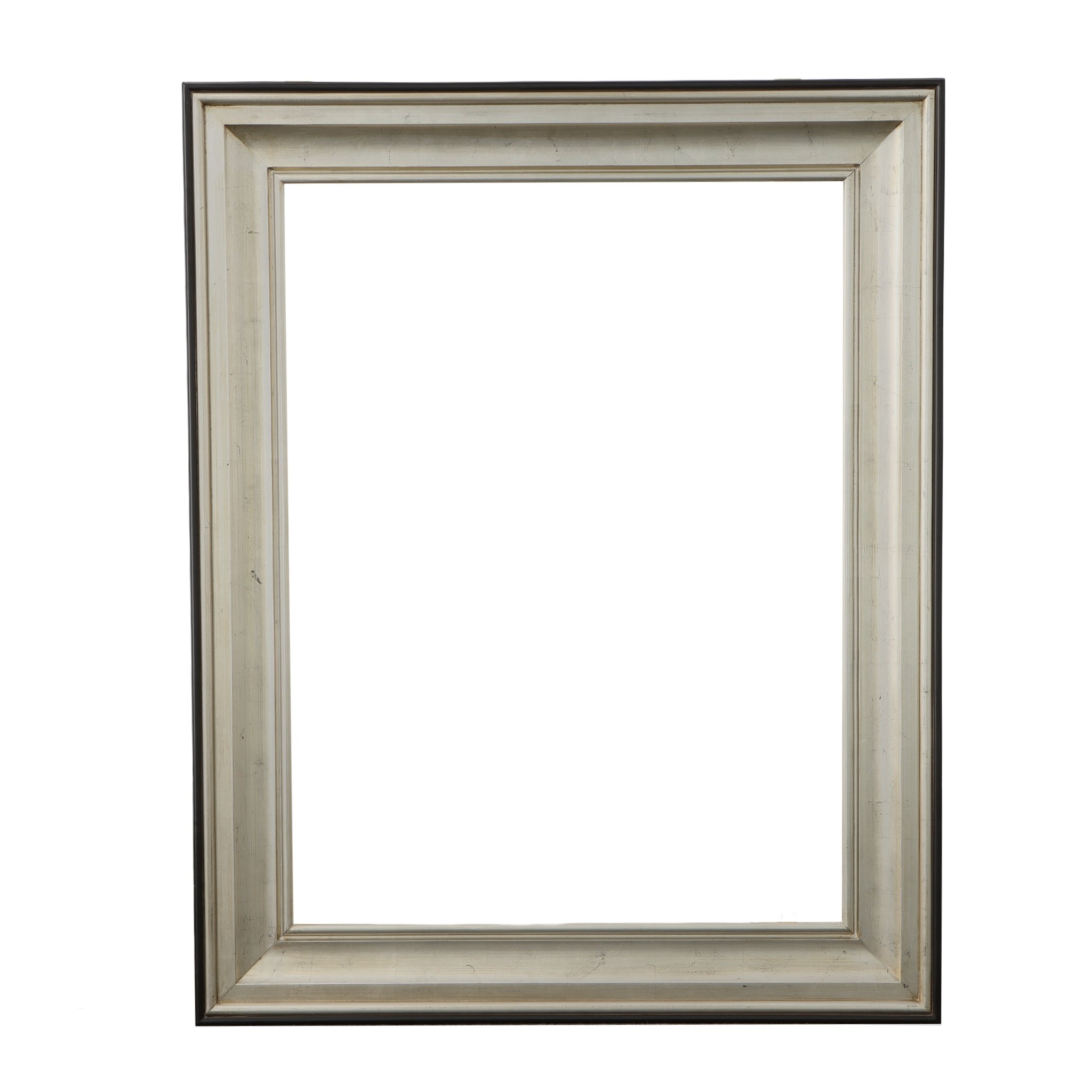 Interior size is 36 x 48 with an overall exterior dimension of 49 x 61 with a profile width of 6.5" and a profile height of 2.5" . Our Silver Raven Frame is currently one of the most popular designs available. It is easy to place and affective at adding value on almost everything it is selected to be used on. It is both transitional as well as contemporary and an affective framers' solution for accenting and defining a variety of popular subjects and interior applications. The frame's clean lines are defined by a striking black exterior and facial edge leading to a striking silver leaf that angles toward the center. The frame is made entirely in solid wood with a wood lip liner detail. For smaller size framing requirements consider using our also very popular, F723 Contempo Silver/Black Frame with its slightly smaller 5 " profile width, in the same beautiful profile and finish. A FRAMERS CHOICE SELECTION !!!