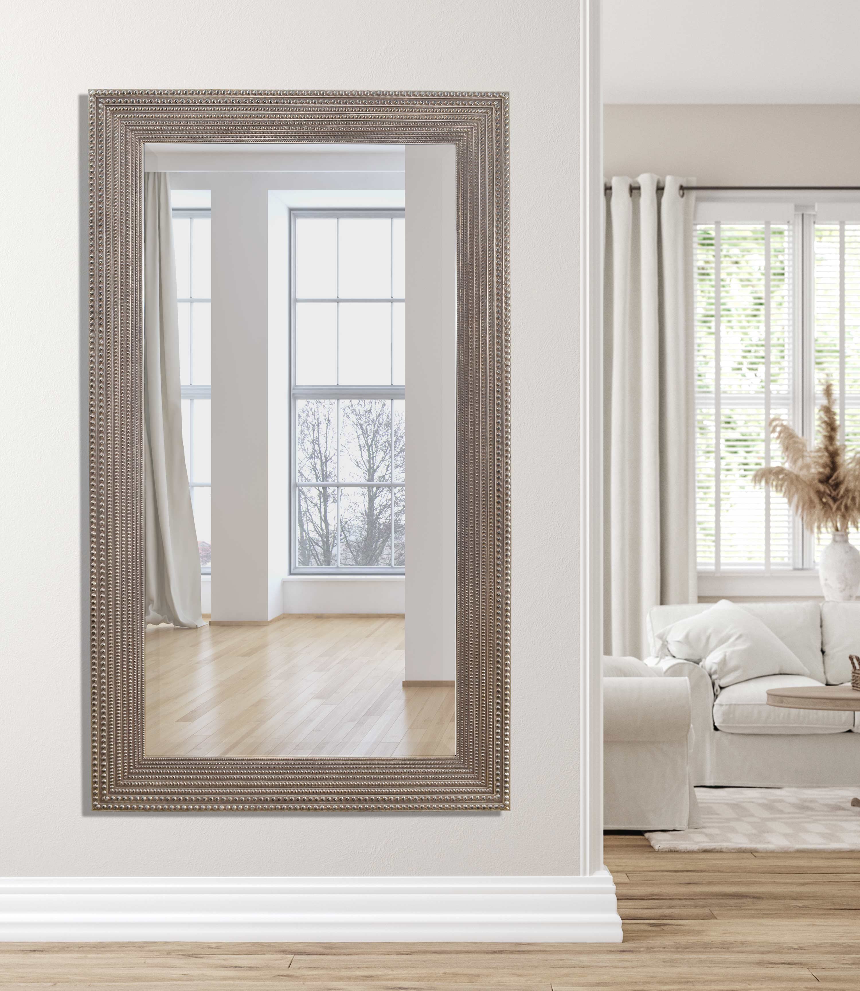 Add a stylish touch to your home with this Beaded Mirror Silver. The stylish rectangular wall mirror is set in a breathtaking frame. Beaded Mirror Silver will brighten and beautify your decor. This wall mirror with a traditional design that will add elegance to any plan. All mirrors are pre-fitted with heavy-duty hangers appropriate for the size and weight of the mirror.