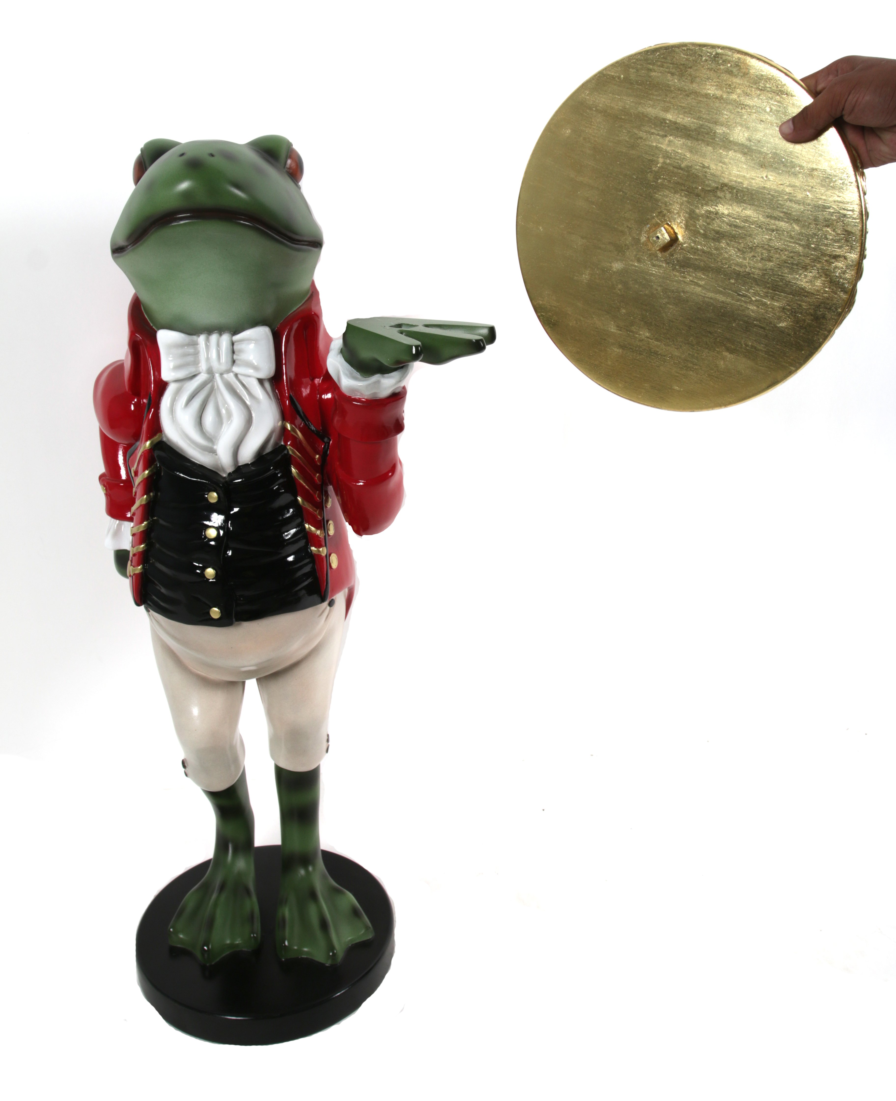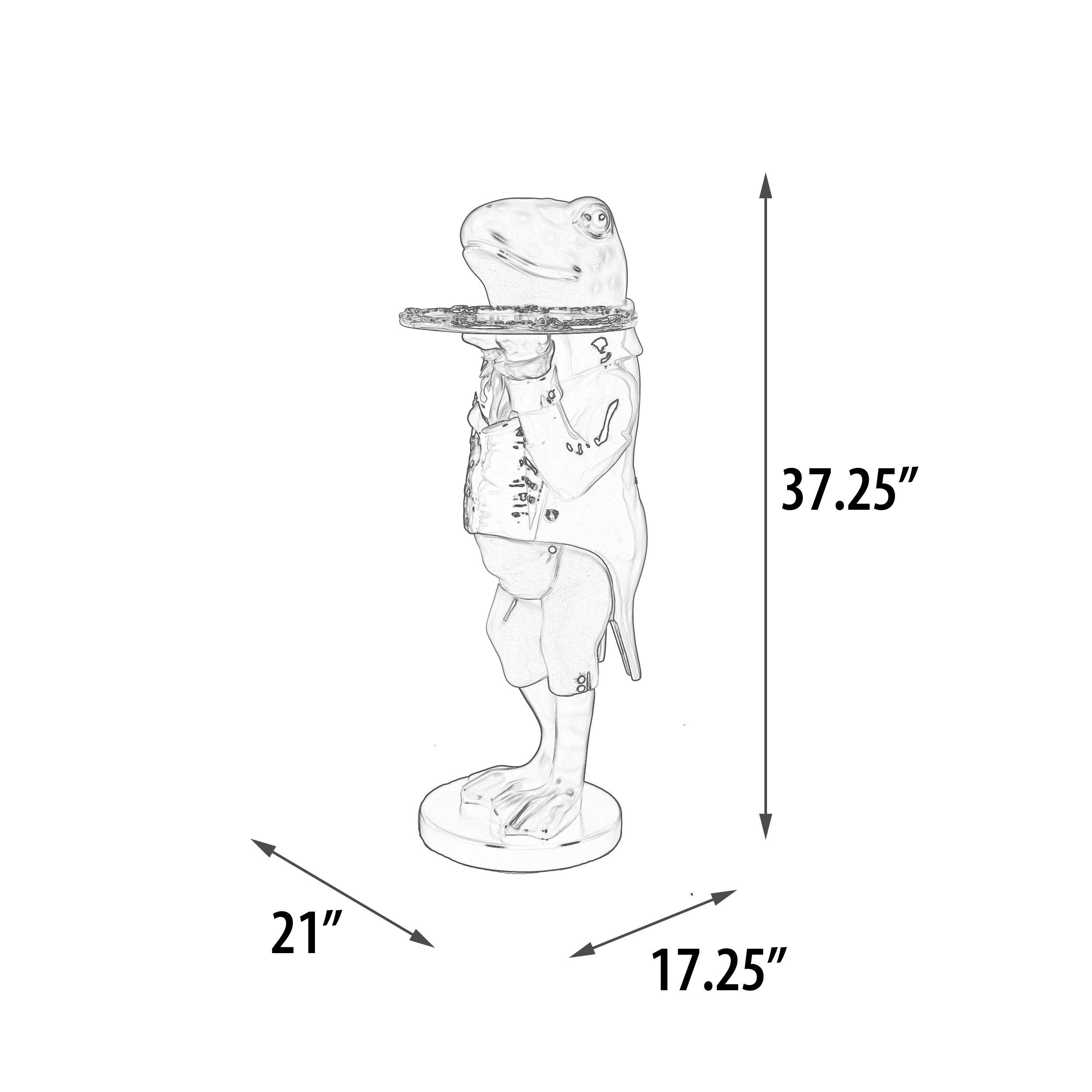 Our exclusive Freddy The Formal Frog Butler 3ft measures 21 inches Wide X 17.25 inches Deep X 37.37 inches Tall. Who can resist not smiling when greeted by Freddy. This Dapper Dude has Savoir Faire and always poised to Please with his outstretched hand holding a purposeful Tray. Each piece is hand cast in durable fiberglass and hand painted by artists in the Philippines. Collect and combine this and other fun characters from Whimsical Treasures, a division of AFD Home. Simple mounting of the tray is all the assembly required