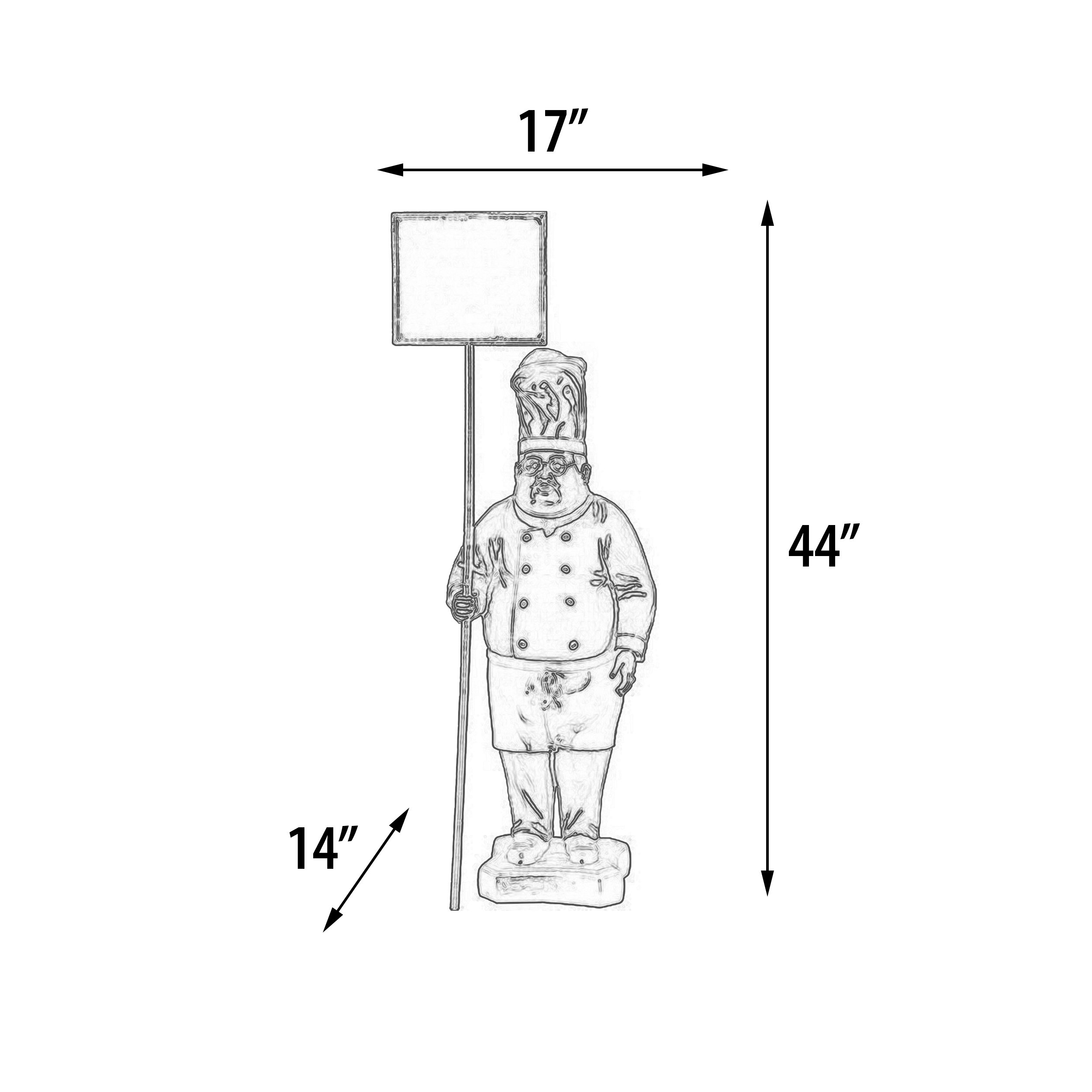 One of our first and still popular chef display signs, our 48" tall Chef holds a pole with Chalk Board for your messaging and daily specials, which is also removable for ease of message changing. An item which will generate a return on investment by drawing attention and generating additional sales all the while providing a twist of fun to the decor. The item is hand made and hand-painted in mixed materials of Fiberglass and MDF. One of several Menu style Boards available from our Whimsical Treasure Collection by AFD Home. No assembly Required!