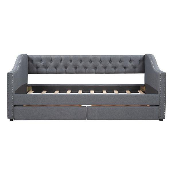 Twin over Full Bunk Bed with Built-in Desk and Three Drawers, GreyThis twin over full bunk bed anchors your room in timeless style. Crafted from solid pine wood and MDF, this twin over full bunk bed showcases slatted head and footboards, clean-lined guard rails, and a built-in ladder.Utilizing every space within the bed's structure, a fully assembled three-drawers and built-in desk are built into the side to give you tons of storage opportunity. It can also be divided into two independent beds for even more convenience.DescriptionBed MaterialPine Wood+MDFSizeTwin/FullColorGreyNumbers of Package2Assembly RequiredYesDimensionsOverall Product Dimension77''L*77.5''W*64''HLoft Bed Dimension75.5''x38''Platform Bed Dimension75.5''x54.3''Total Height64''Number of Each Bed Slats14/14pcsOverall Product Weight180lbUpper/Down Bed Weight Capability250/400lbUpper/Down Bed Mattress Thickness6''/8-10''[Elegant design] Elegant style Upholstered in carefully-selected linen fabric, in elegant gray, feature a diamond-tufted backrest and two armrests with rivets, this daybed not only suits any home décor, but is timeless in its design. The soft textile bedhead creates coziness, while the single color of the design creates versatility.[Solid & Sturdy] The daybed frame is made of solid MDF and particle board, providing a dense and strong support. The construction ensures both a lifetime of use, and a sturdy frame with a backrest which won't wobble.[Maximized space] A pair of drawers under the daybed provide ample storage for your little one's toy's and bedding. Such a versatile piece, bringing functionality, versatility, and style to your home, perfect for those who have lots of visitors.[No Box Spring needed] This daybed frame comes with sturdy wooden slats. Mattress is not included. A comfy linen fabric backrest and two armrests that bring you and your family a cozy feeling.[Dimensions] Overall Product Dimension:82.2" x 4 .7" x 34.4"(L x W x H). Mattress not included. Some assembly is required, although we have provided clear instructions and tools.