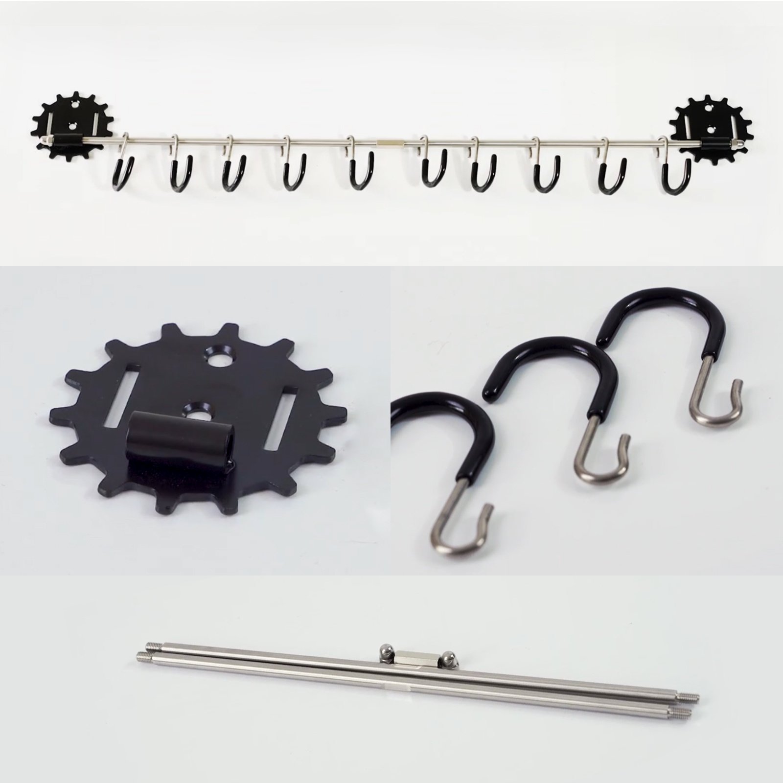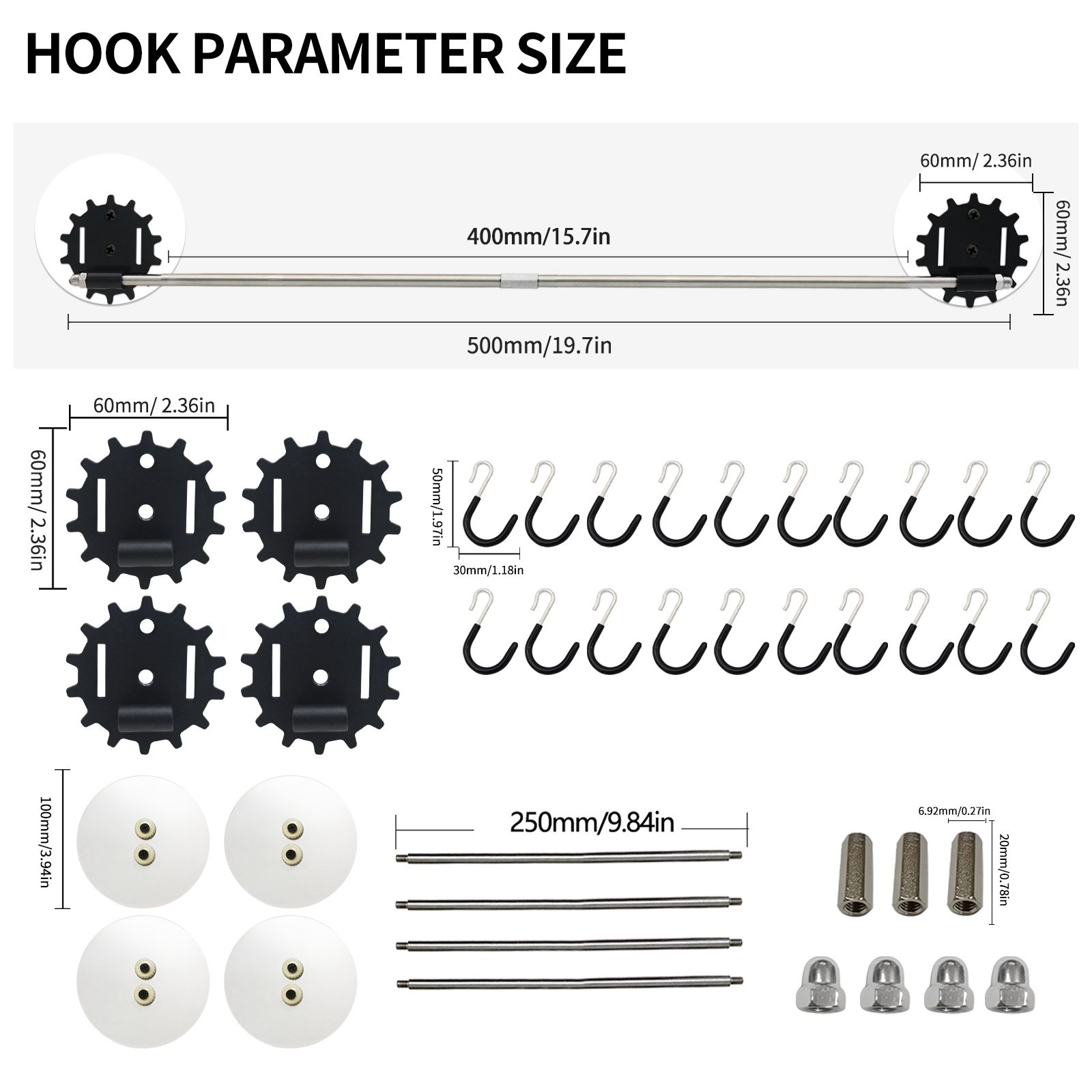 2.2. [2 sets of 20-inch garage hooks] This hook can be adjusted in width and quantity, there are 10 hooks, and the guide rail is very suitable for hanging spatula and other baking, a total of 20. It holds approximately 16.5 pounds. (Try to avoid going near the center of the hook, which may bend slightly.)